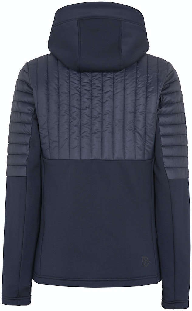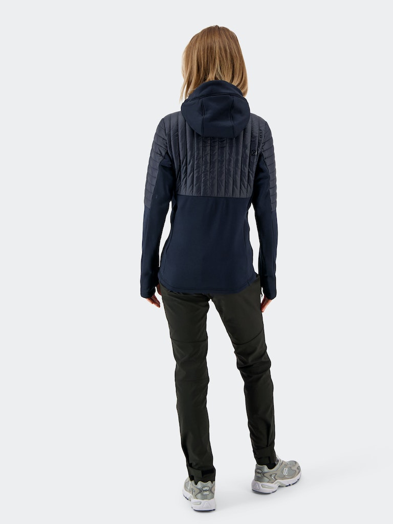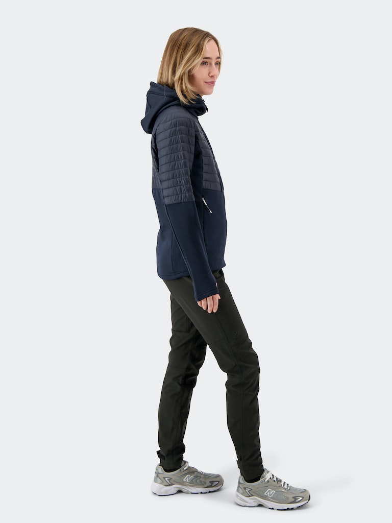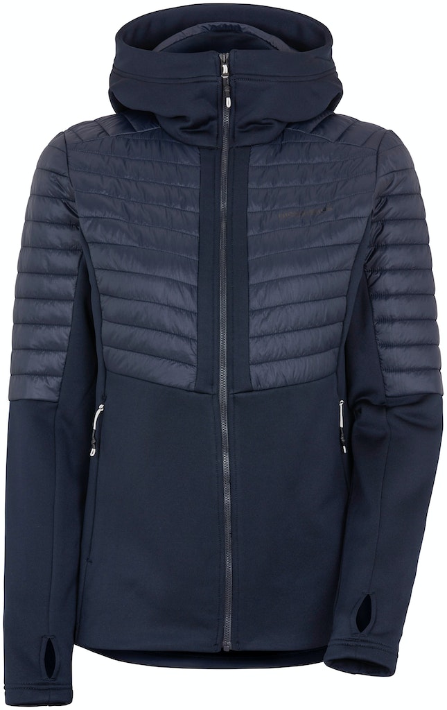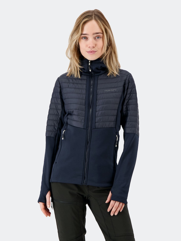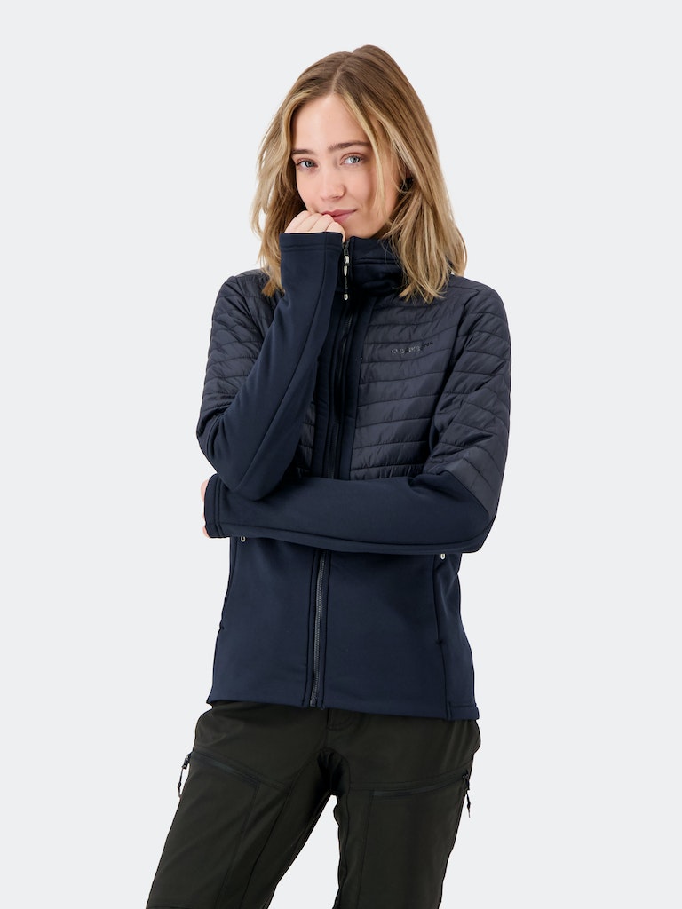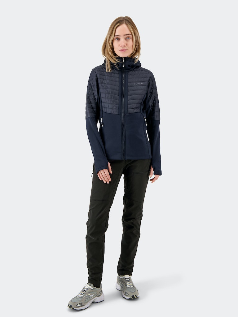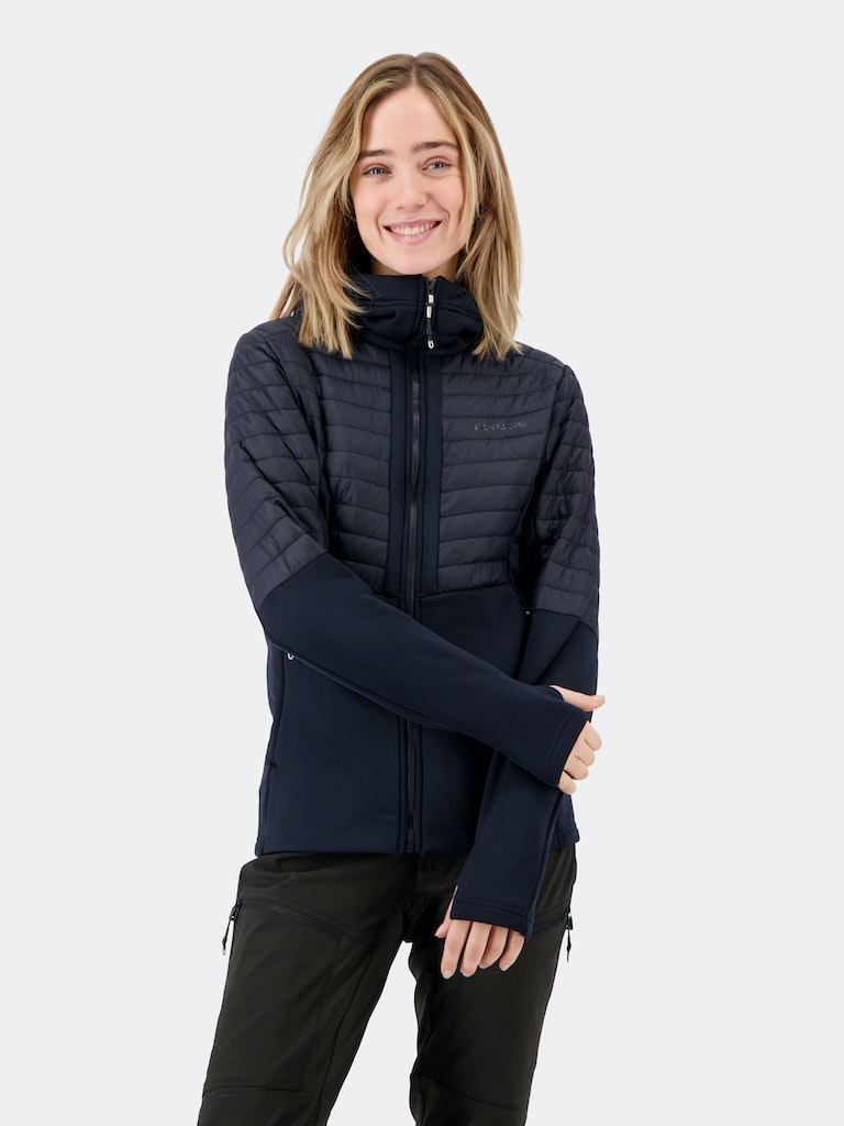 Puff hybrid jacket perfect as insulation jacket or by it self, filled with EVO down on woven quilted part, mixed with knitted polyester fabric, cosy high collar/hood, 1) Nylon recycled woven rib-stop, lightweight 2) Stretch fleece, brushed inside, Classic fit - feminine shape, Functional hybrid jacket with two pockets at front with zipper closure, jacket can be worn both as insulation or by itself.