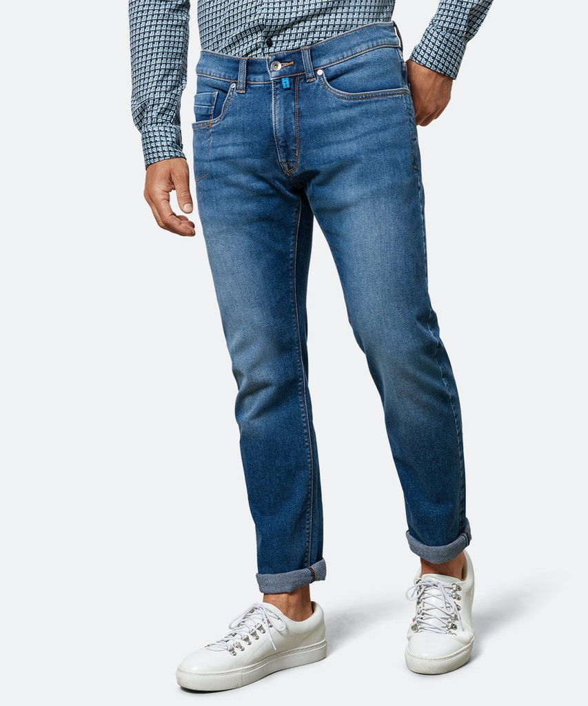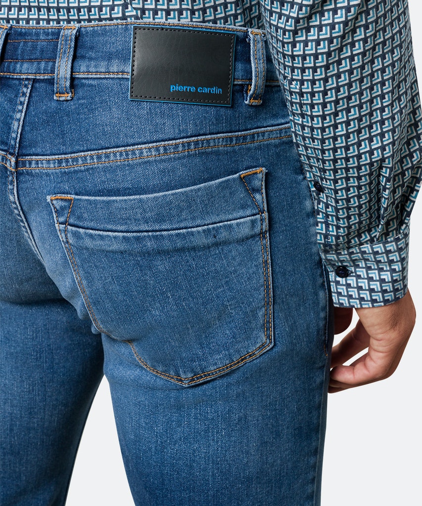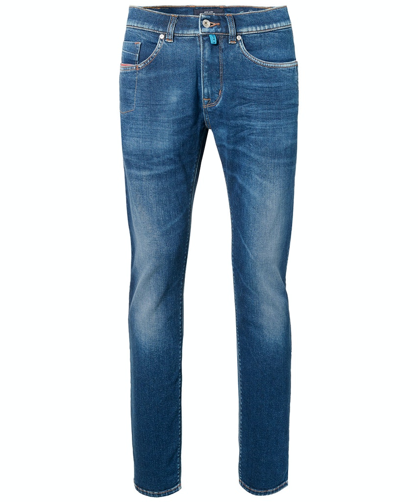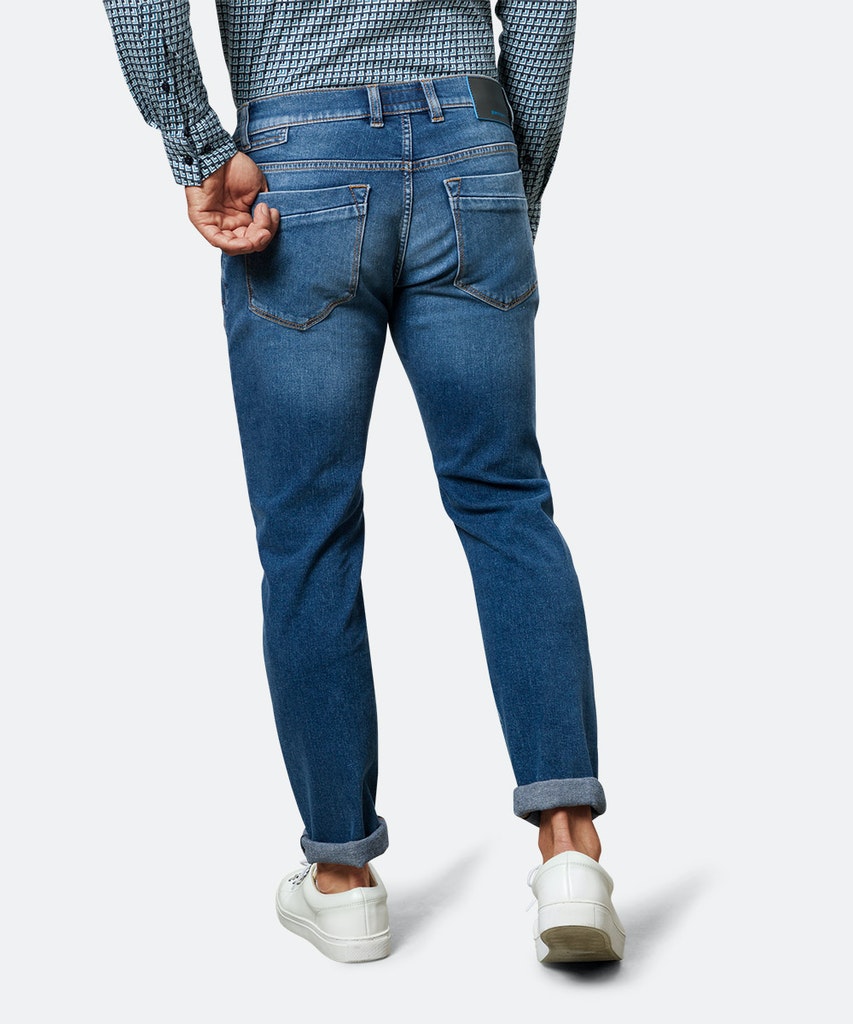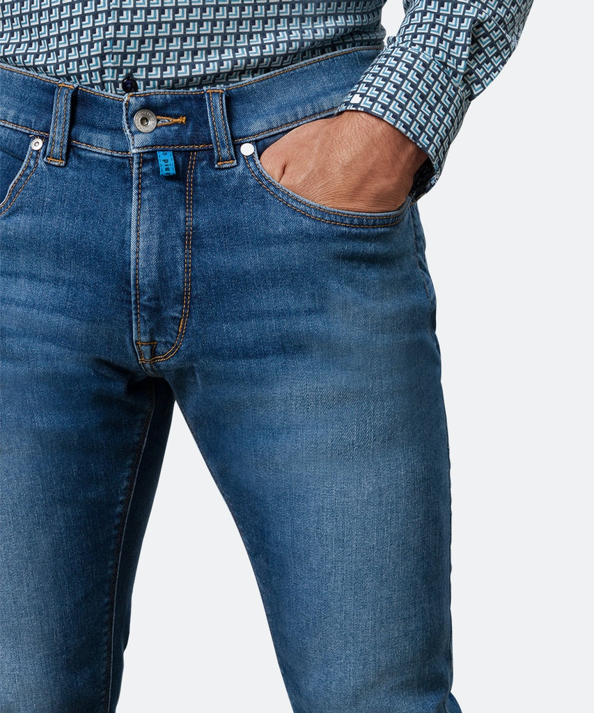 authentisches Premium-Blau gefärbtes blaues Denim, natürlich indigo-gefärbt; echte authentische Behandlung mit nachhaltigem Laser-Verfahren; weiches Griffgefühl, pflegeleicht und feinste Baumwolle