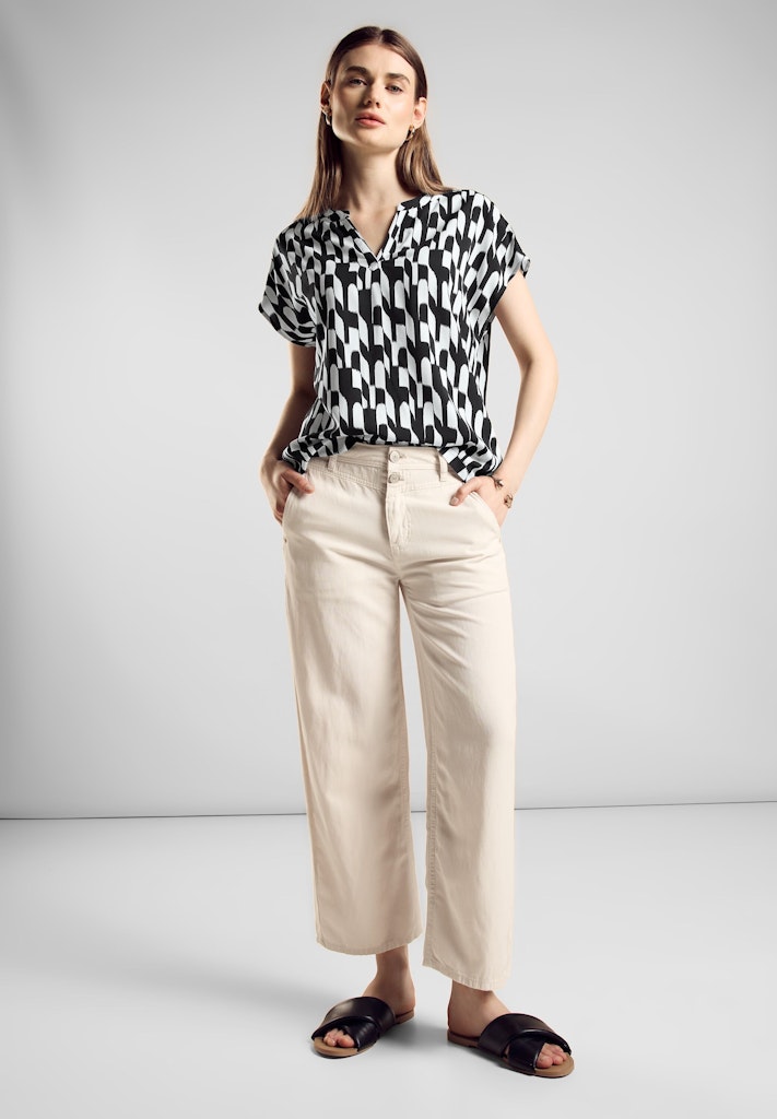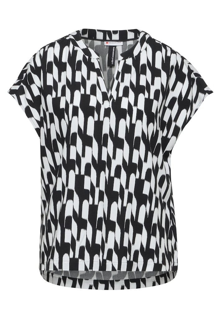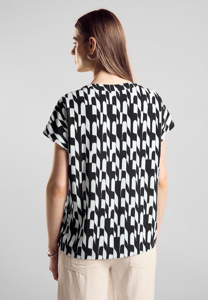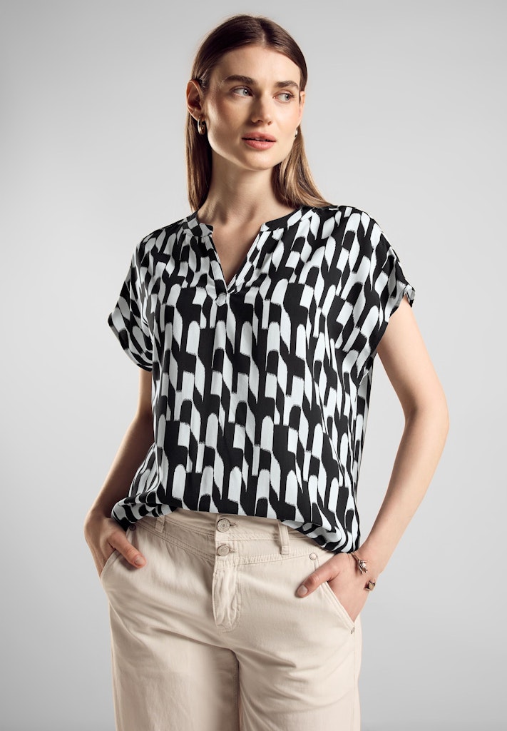 Diese bedruckte T-Shirt-Bluse von Street One mit Rundhals und Schlitz vorne bietet einen leichten und bequemen Tragekomfort. Gefertigt aus softer Viskose, ist sie ideal für den Alltag. Das grafische Muster verleiht jedem Outfit eine lebendige Note.