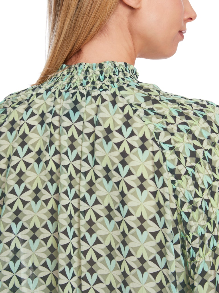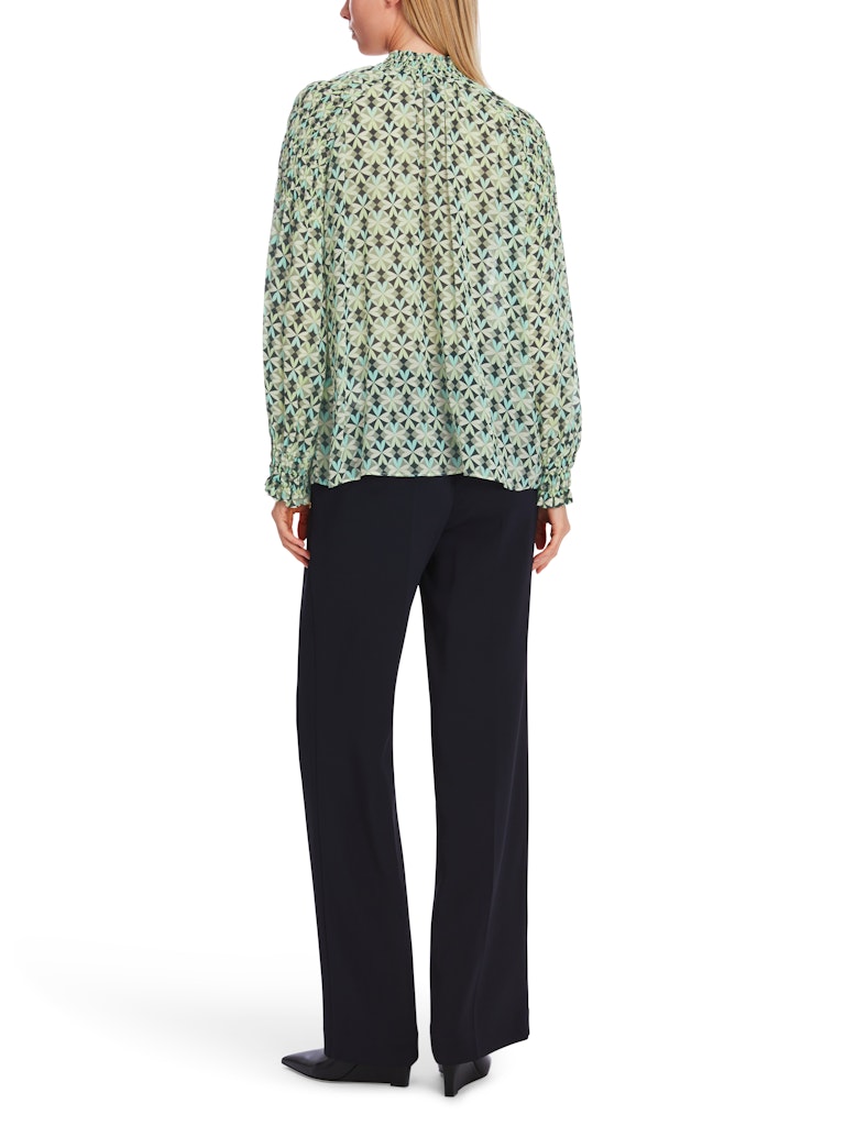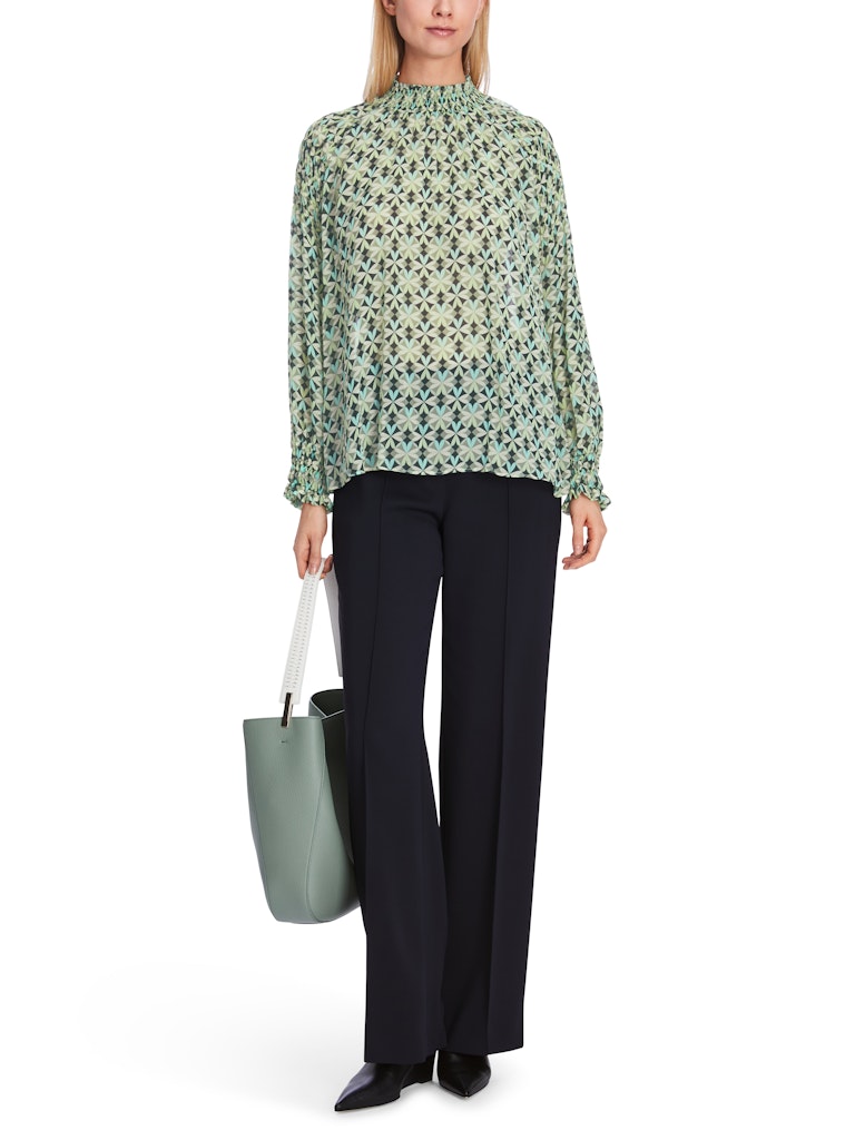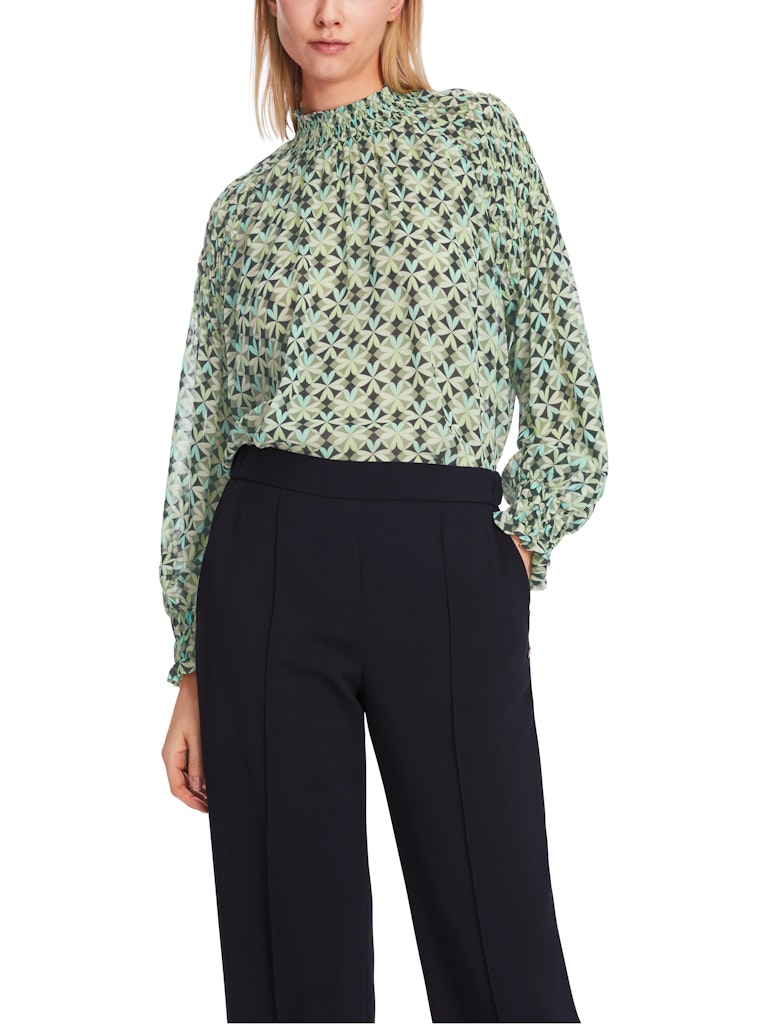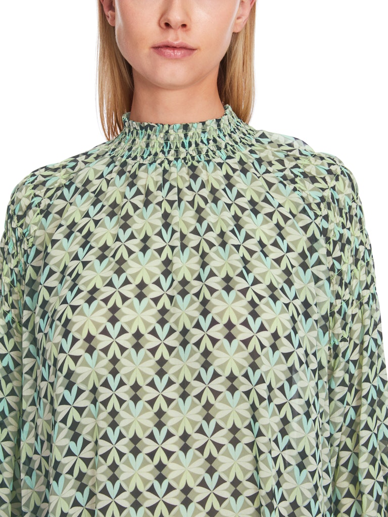 Bluse mit Smok-Einsätzen|Die Smok-Einsätze am Stehkragen, den Schultern sowie den Ärmelbündchen verleihen dieser Bluse ihren besonderen Stil. Ergänzt wird der Look durch ein floral inspiriertes Grafik-Muster. Die Bluse präsentiert einen weiten Schnitt. Die weich fließende Viskose rundet das feminine Design ab.|Weiter Schnitt|Stehkragen|Floral inspiriertes Grafik-Muster|Weich fließende Viskose|Das Model ist 179 cm groß und trägt N3/38.