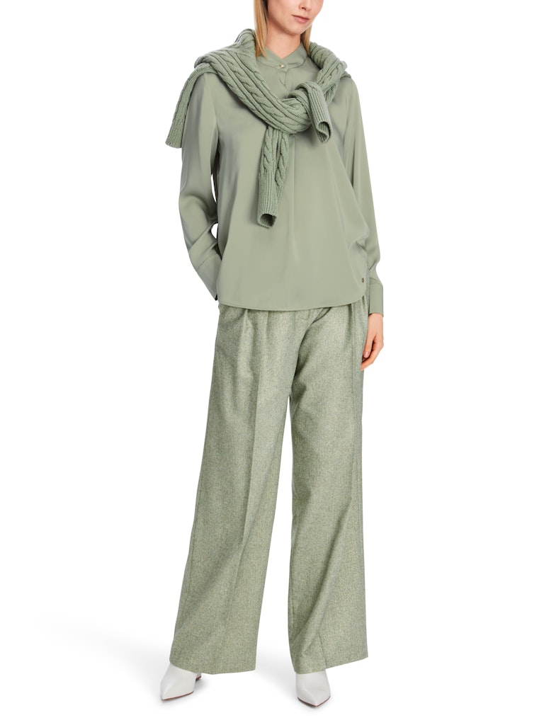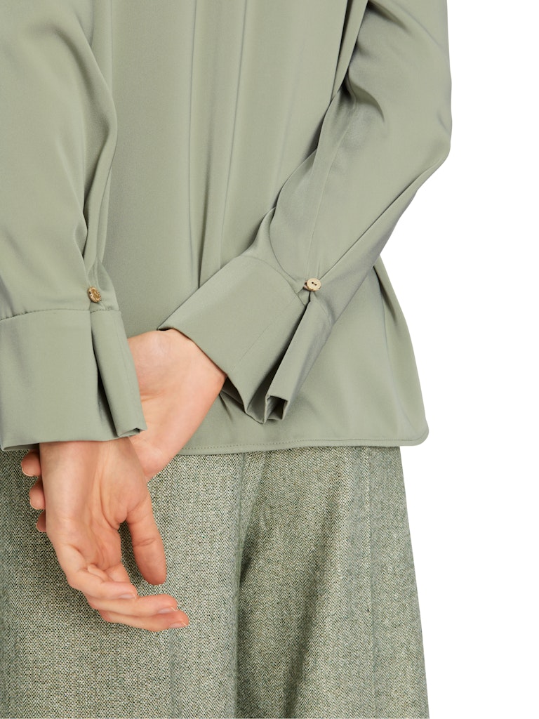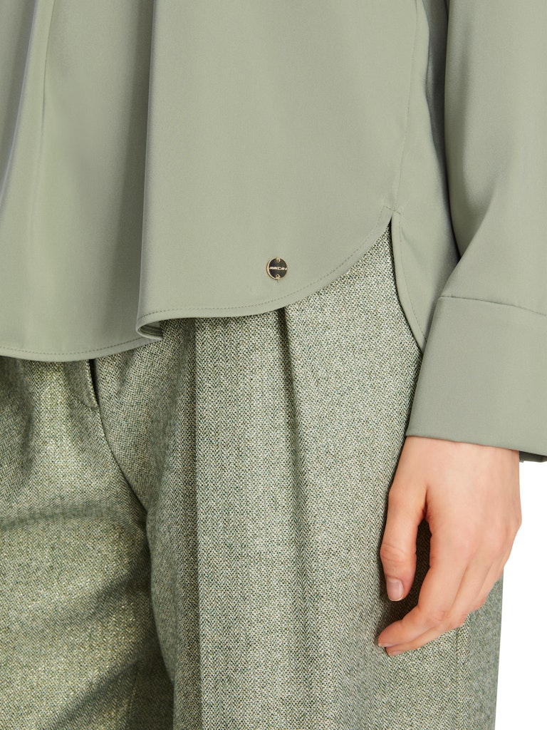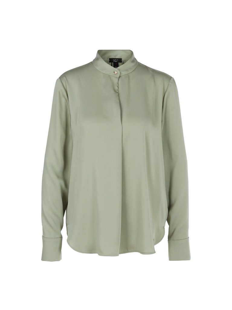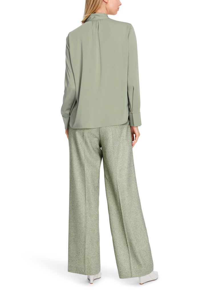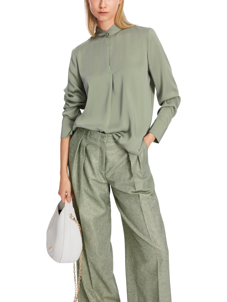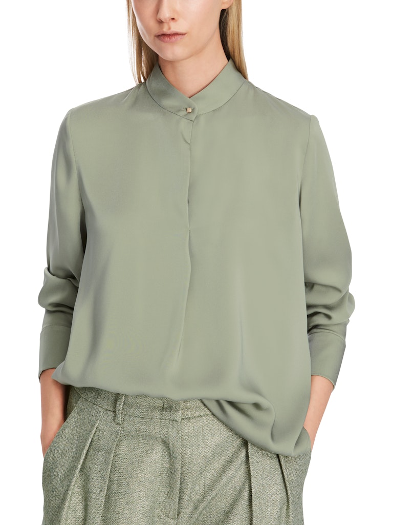 Bluse mit Stehkragen|Ein zeitloses Basic für viele Looks ist diese unifarbene Bluse aus weich fließendem Material. Sie kommt mit knöpfbarem Stehkragen und geschlitztem Ausschnitt. Die Armmanschetten sind mit einem glänzenden Knopf versehen. Durch die Kräuseldetails im Rücken erhält die Bluse eine lockere Silhouette. Seitenschlitze ergänzen den Schnitt.|Lockere Sillhouette|Geschlitzter Ausschnitt|Made in Europe|Weich fließend|Das Model ist 179 cm groß und trägt N3/38.