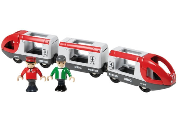 Bitte einsteigen! Dreiteiliger Personenzug inklusive Lokführer und Reisegast. Der rote Linienzug ist startbereit, um Passagiere zu ihrem Zielbahnhof zu bringen. Fahrerkabine und Zugabteile lassen sich für das Rollenspiel öffnen. Ab 3 Jahren. Lernziel: Motorik, logisches Denken, Kreativität. Maße: 27,9 x 3,8 x 5,1 cm