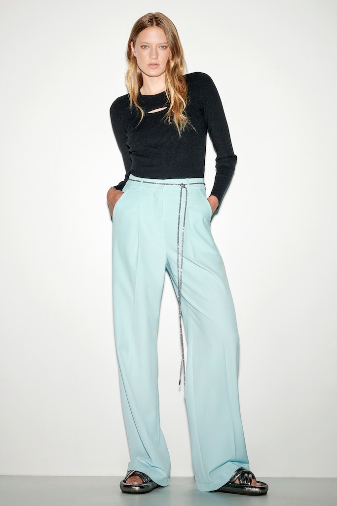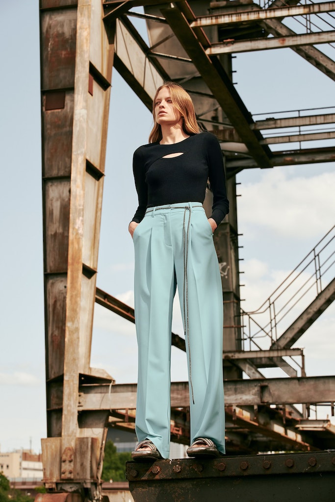 Weit geschnittene Hose mit Bundfalten aus weicher, schwer fallender Techno-Wolle. Die Hose ist mit Gürtelschlaufen, seitlichen Eingrifftaschen und angedeuteten Gesäßtaschen ausgestattet.