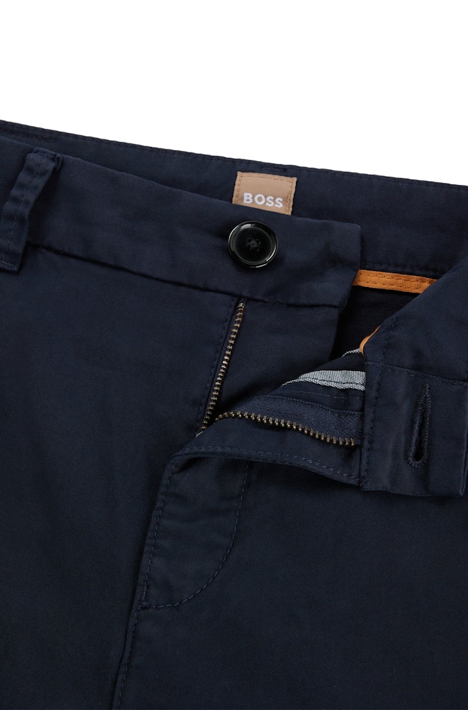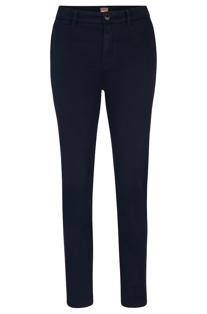 Angeraute BOSS Hose aus elastischem Baumwoll-Satin. Der gerade geschnittene Style präsentiert sich mit mittlerer Bundhöhe, konischem Beinverlauf und Cropped-Länge.