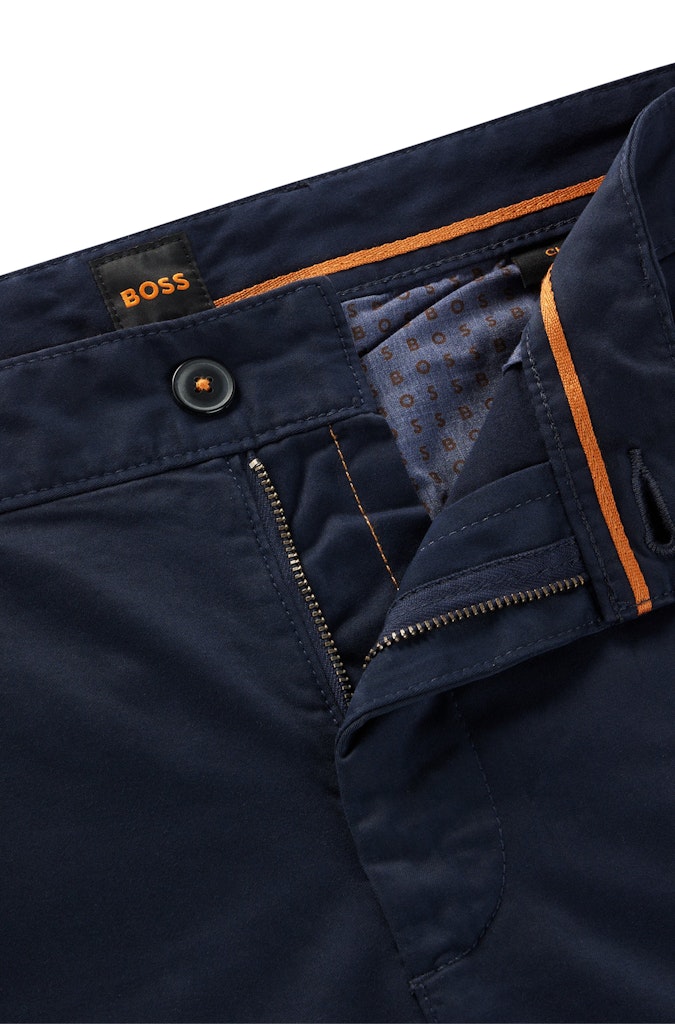 BOSS Chino aus Stretch-Satin mit schmaler Passform, mittlerer Bundhöhe und cleaner Silhouette.