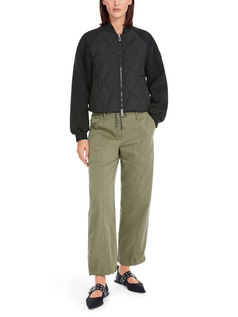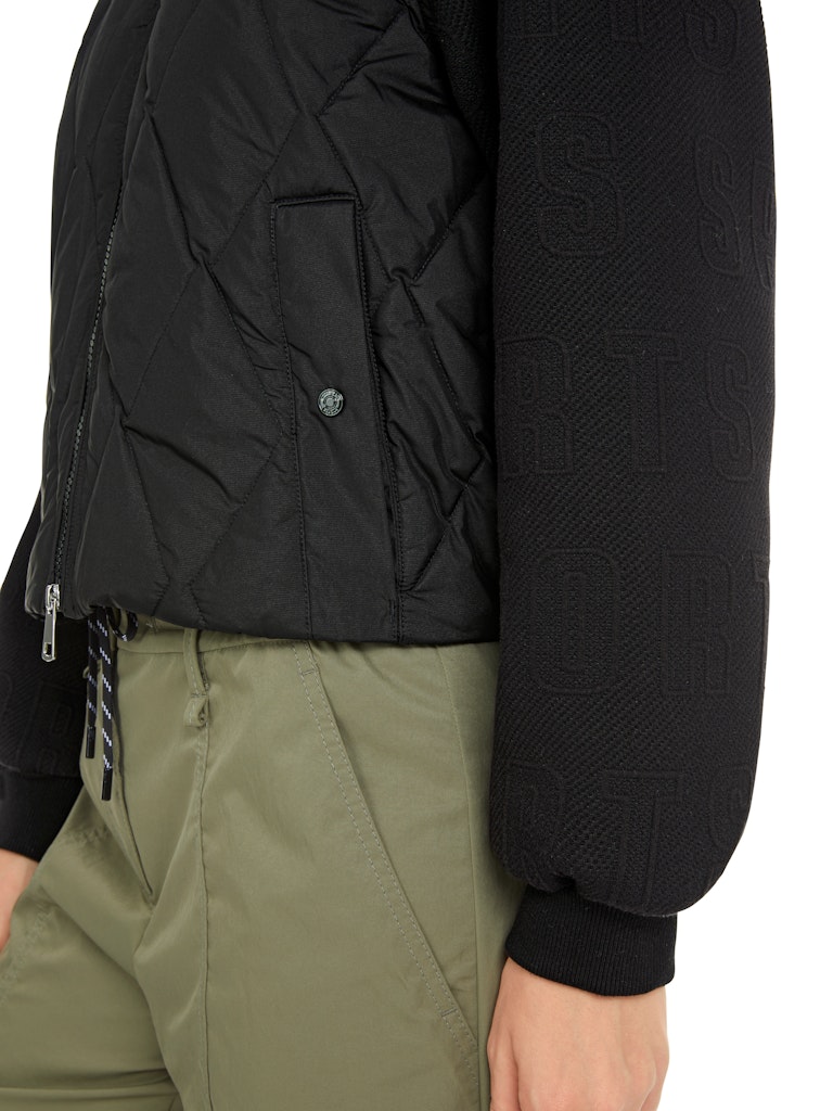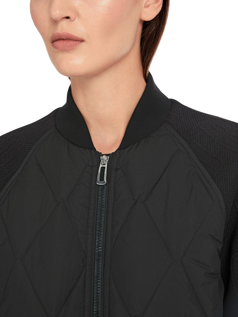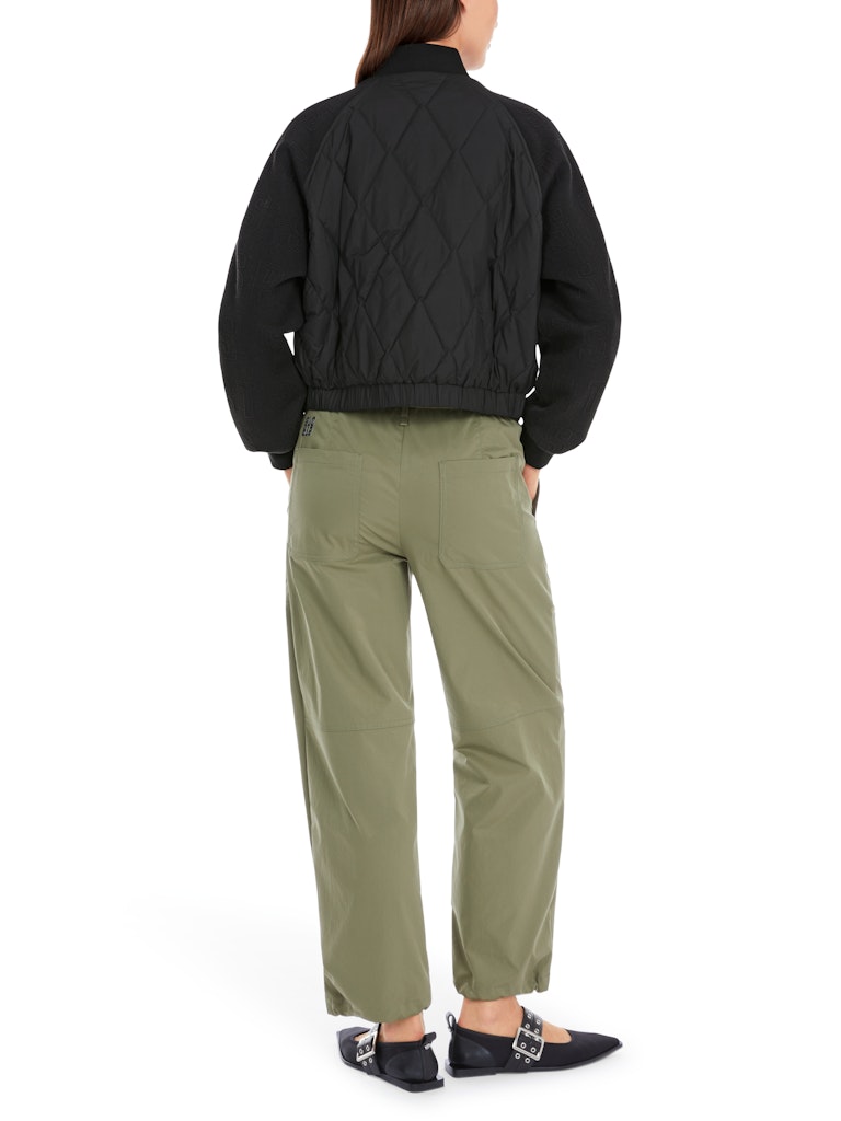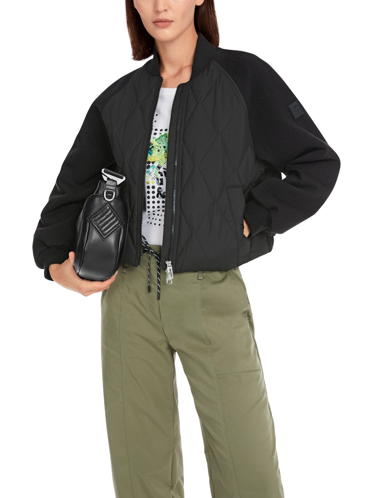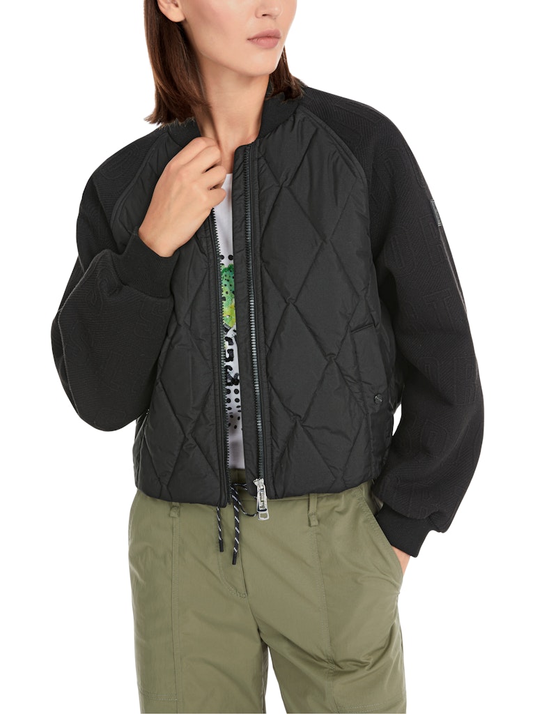 Cropped Jacke "Rethink Together"|Die Form ist betont weit und der Raglan-Ärmel tief angesetzt - cropped Jacke im Baseball-Stil. Das Material der Ärmel hat eine Struktur mit Schriftmotiv. Im Kontrast dazu: der Leib mit der Karosteppung. Die Rückenweite ist im Saum mit einem Gummizug reduziert. Das Modell enthält recycelte Fasern und trägt das Nachhaltigkeitslabel "Rethink Together".|Oversized|Rethink Together|Reißverschluss|Gefüttert|Das Model ist 179 cm groß und trägt N3/38.