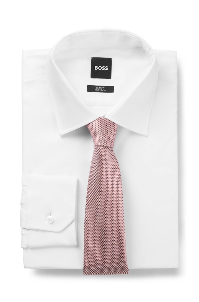 Elegante BOSS Krawatte mit 7,5 Zentimetern Breite. Das Accessoire aus einem soften Seiden-Mix ist mit einem detailliertem Jacquard-Muster versehen.
