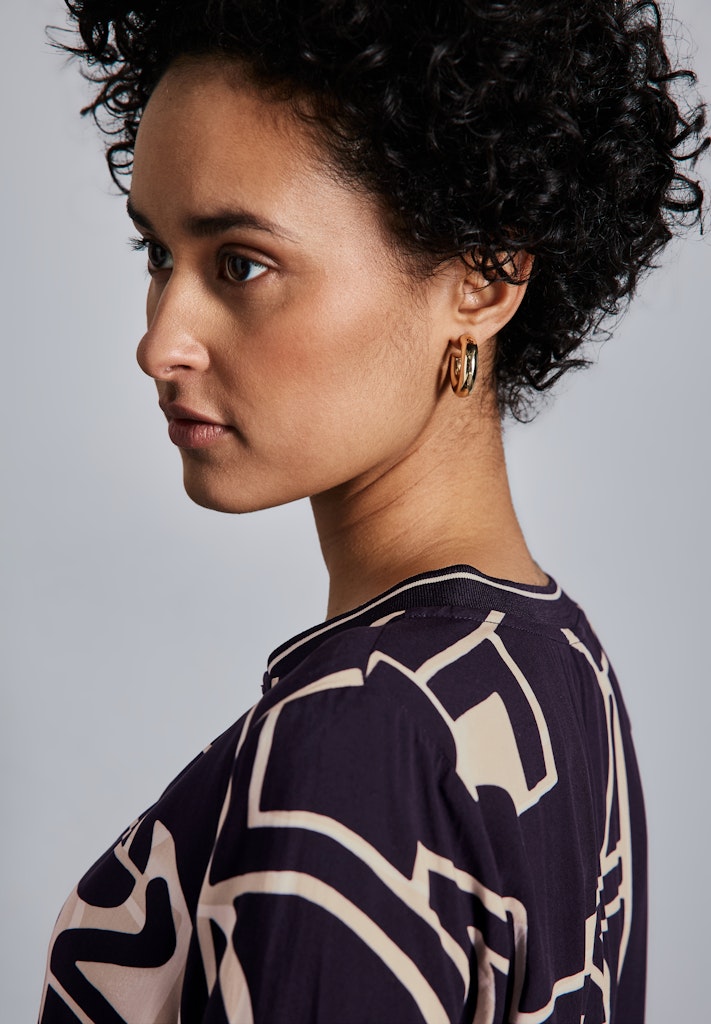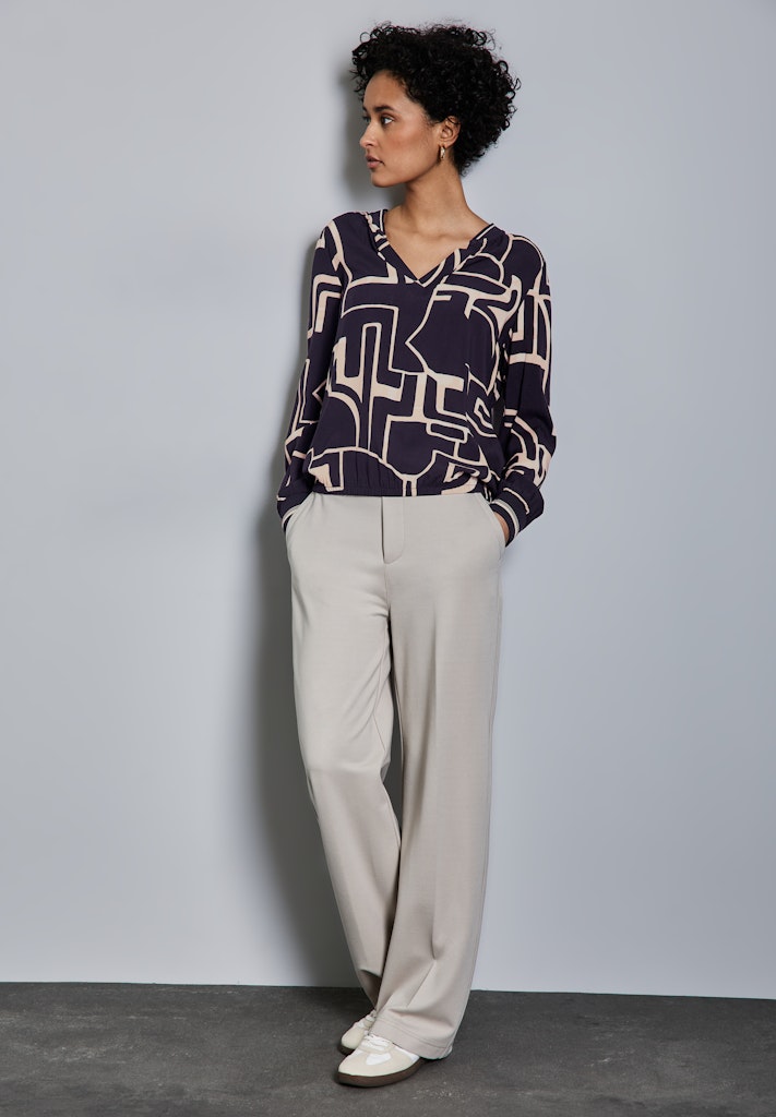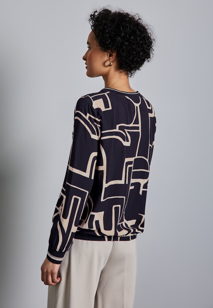 Die bedruckte Bluse von Street One für Damen überzeugt mit einem grafischen Muster und gestreiften Bündchen an den langen Ärmeln. Der elastische Saum sorgt für eine bequeme Passform und die softe Viskose-Qualität liegt angenehm auf der Haut. Damenbluse Geschlitzter Ausschnitt Langarm mit gestreiften Bündchen Elastischer Saum Softe Viskose-Qualität Material: 100% Viskose