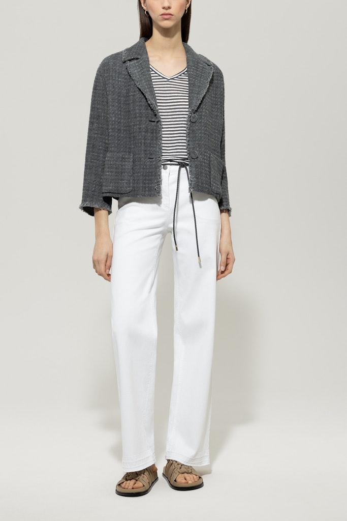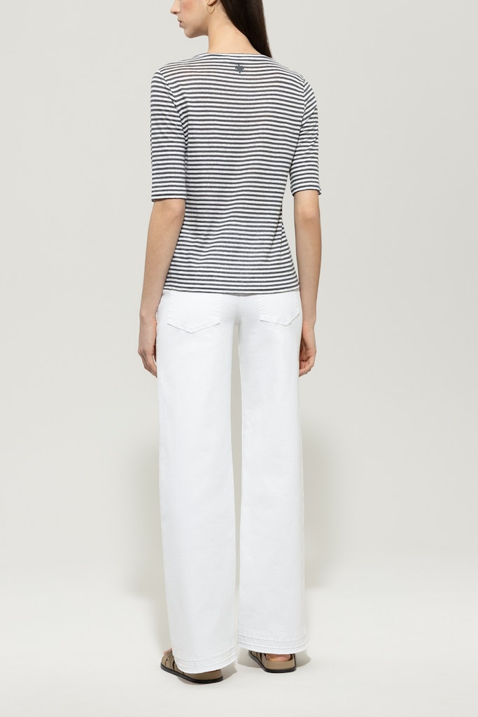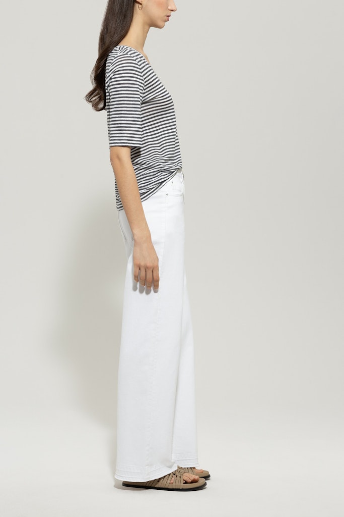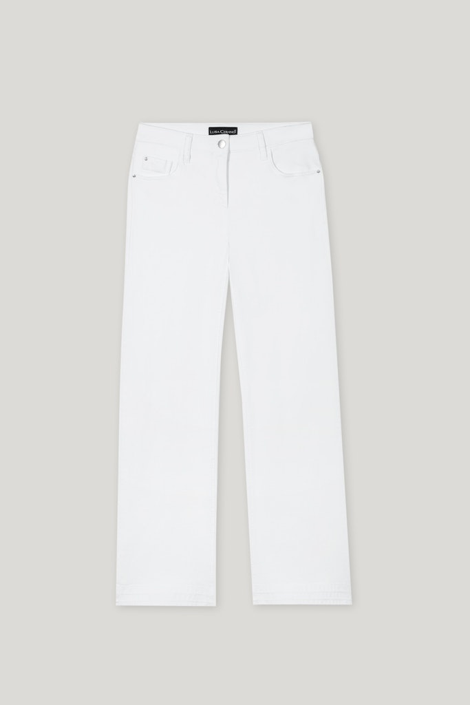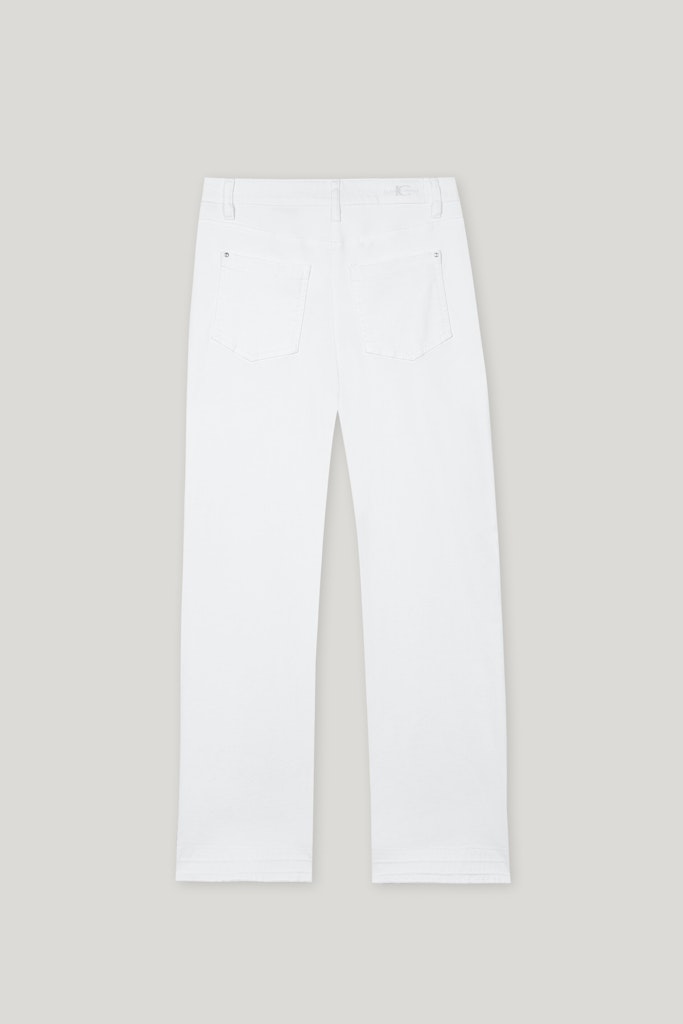Denim-Pants mit Twill-Struktur in Reaktiv-Färbung. Die Wideleg-Silhouette mit offener Saumkante verleiht dem klassischen Five-Pocket-Design mit Gürtelschlaufen einen modernen Touch.