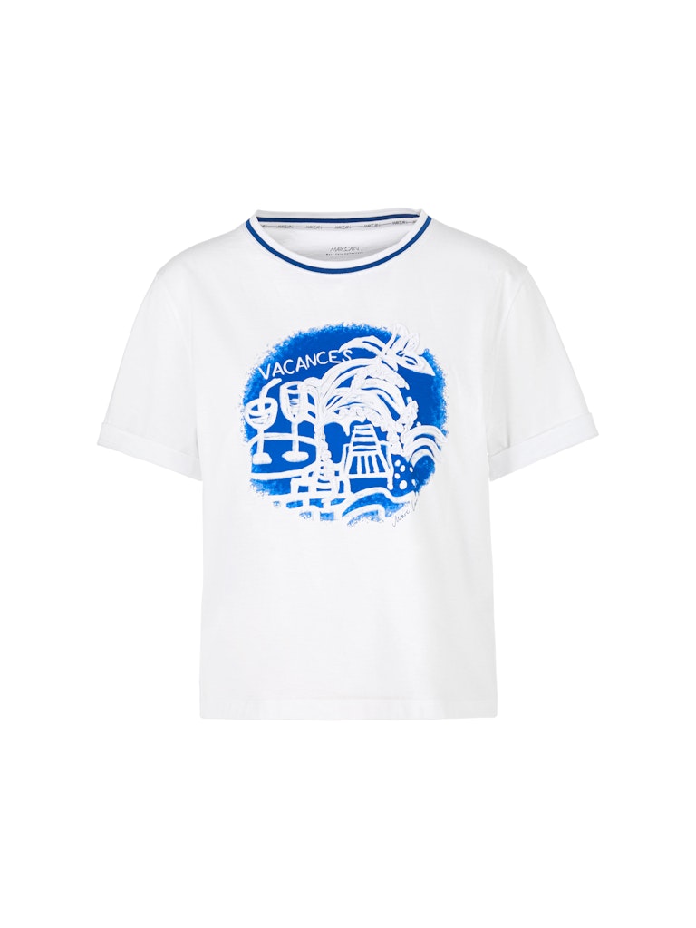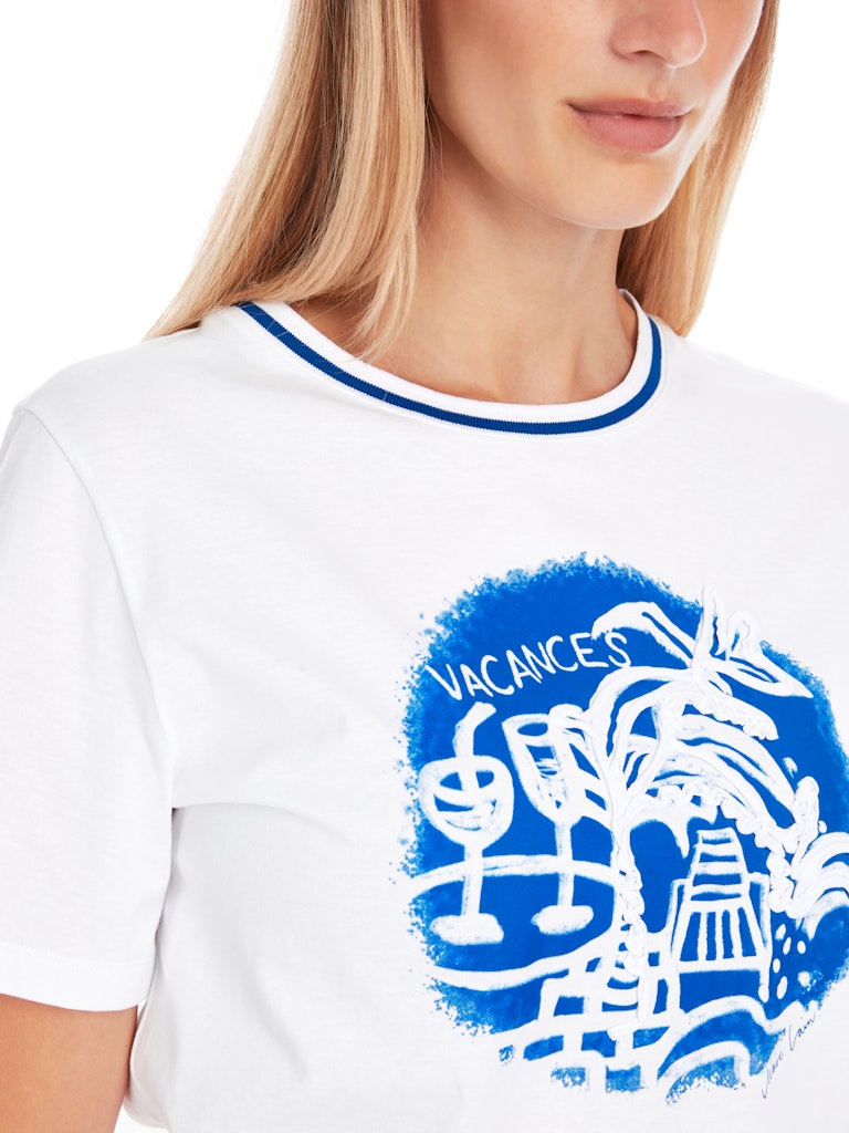 Bedrucktes T-Shirt "Rethink Together"|Ein runder Druck mit 3D-Effekten und Vacances-Schriftzug machen dieses T-Shirt zum lässigen Statement-Style. Mit seiner hochwertigen Bio-Baumwolle trägt es das Nachhaltigkeitslabel "Rethink Together". Das Oberteil hat einen lockeren Schnitt mit Turn-up-Ärmeln und Rundhals.|Lockerer Schnitt|3D-Effekte|Rethink Together|Turn-up-Ärmel|Das Model ist 179 cm groß und trägt N3/38.
