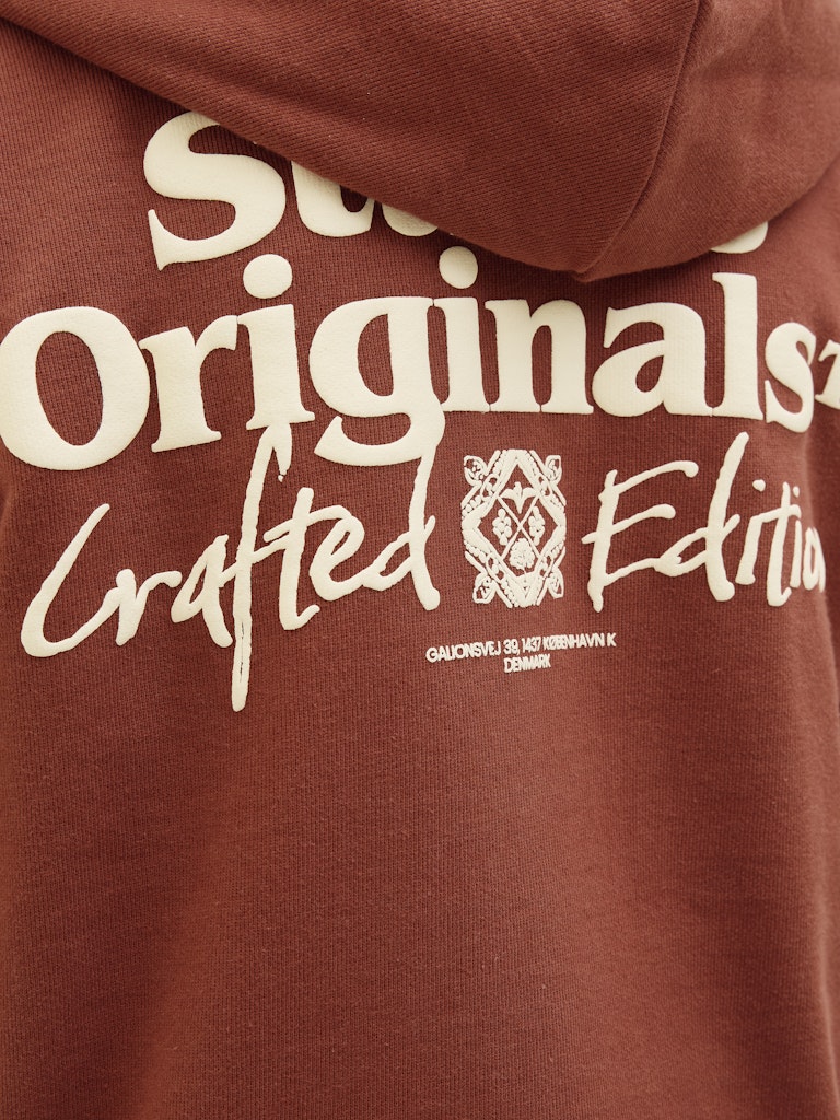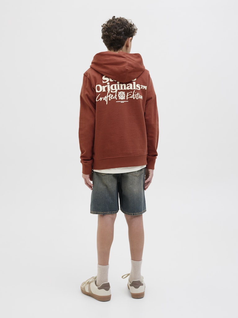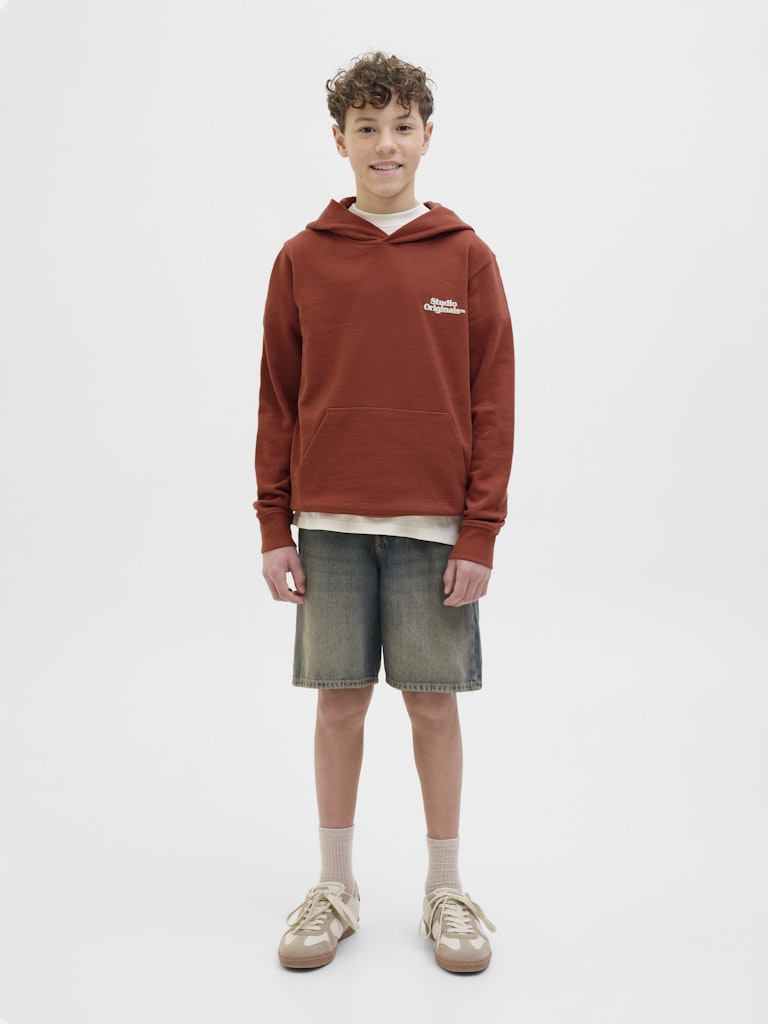 Keine Garderobe ist komplett ohne einige bewährte Basics wie Sweatpants.Angerauter Stoff mit einer weichen Innenseite. Leicht angeraute Stoffe haben eine etwas flauschigere Innenseite, die sich weich anfühlt.Entdecke die aufregende Welt von Jack and Jones Junior, in der Mode durch jugendliche Energie und lebhaften Charme zum Leben erweckt wird. Unsere Kollektionen bieten eine Mischung aus neuen, trendigen Designs, die Jungen im Alter von 3-16 Jahren ansprechen. Tauche in hochwertige und bequeme Styles ein, die speziell für junge Fashion-Liebhaber entwickelt wurden. Bei Jack and Jones Junior interpretieren wir Mode für Jungs im Alter von 3 bis 16 neu, indem wir coole Passformen und moderne Styles kombinieren und dabei immer wieder Elemente aus der Erwachsenenmode einfließen lassen.. - Produkttyp : Kapuzenpullover - Hals : Kapuze - Ärmel : Langarm - Ärmel : Eingesetzte Ärmel - Manschetten : Gerippte Ärmelbündchen - Taschen : Känguru Tasche - Futter : Futter Kapuze aus gleichem Material - Print : Muster auf der Rückseite des Produkts, Gummidruck für Weichheit - Körperform : Junior - Passform : Locker geschnitten