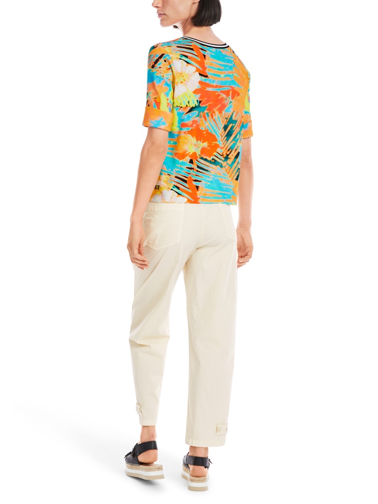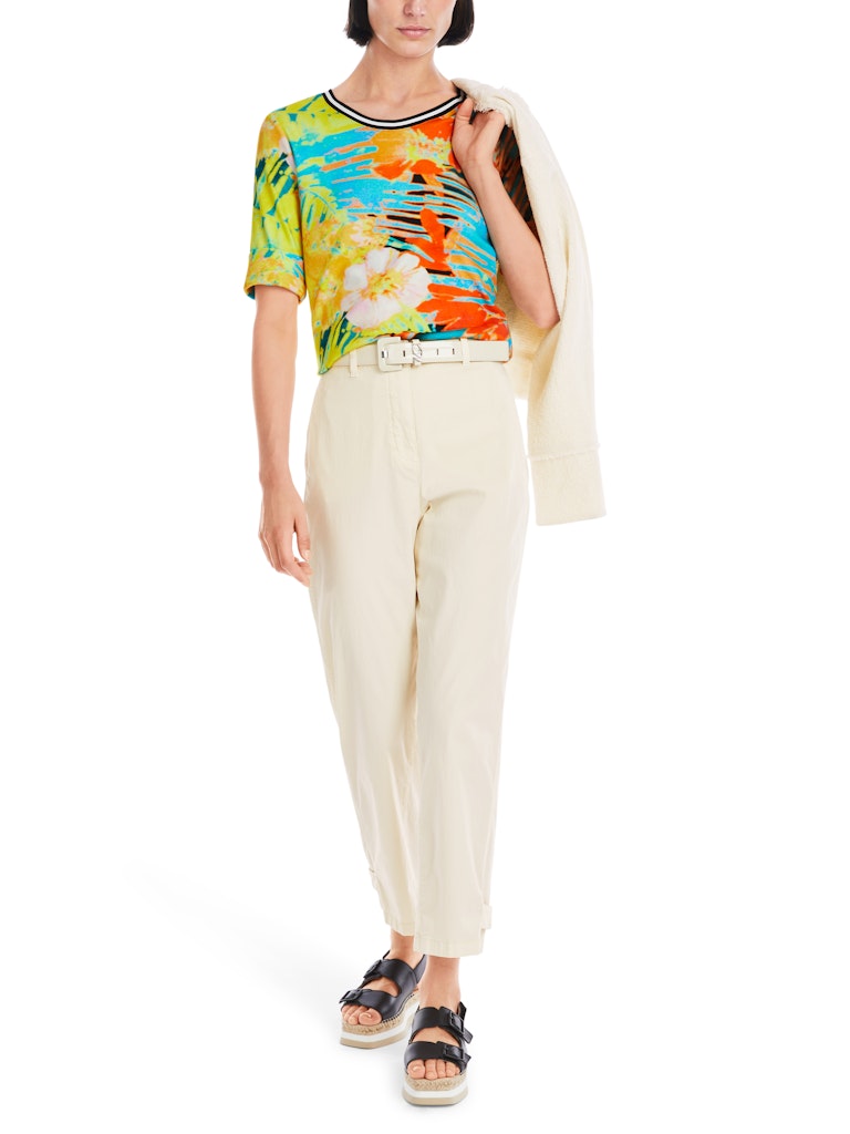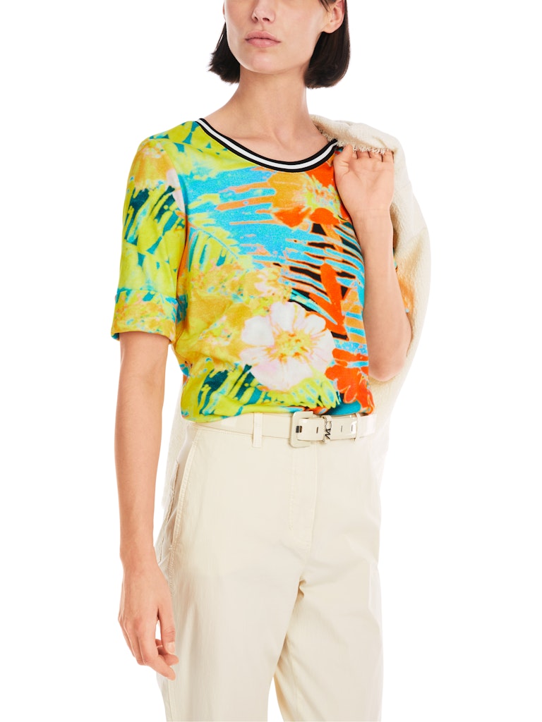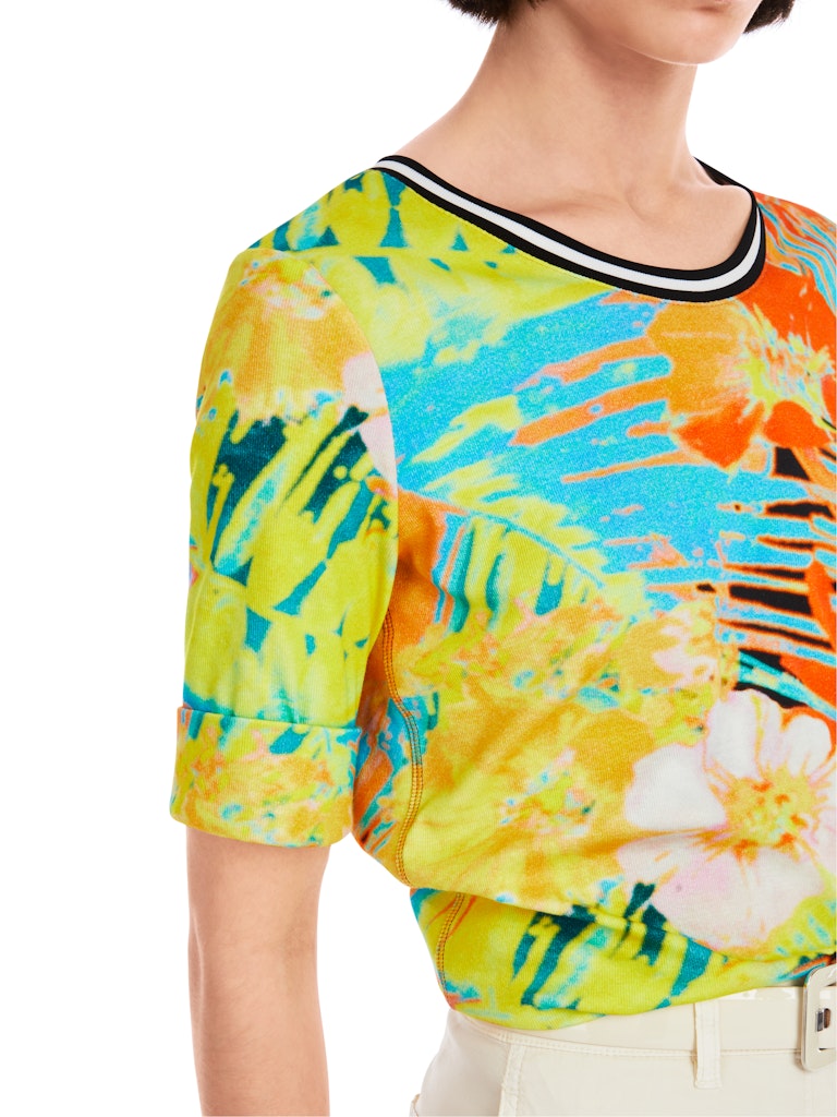 Rippen-T-Shirt im Hawaii-Dessin|Ein auffälliger Begleiter an warmen Sommertagen ist dieses coole Rippen-T-Shirt aus angenehmem Baumwollstretch. Es zeigt allover ein exotisches Hawaii-Dessin. Der weite Rundhalsausschnitt ist mit einem kontrastfarbenen Streifen verziert. Das Shirt hat eine taillierte Silhouette und kurze Ärmel.|Taillierte Silhouette|Weiter Rundhals|Kontrastfarbene Streifen|Angenehmer Baumwollstretch|Das Model ist 179 cm groß und trägt N3/38.
