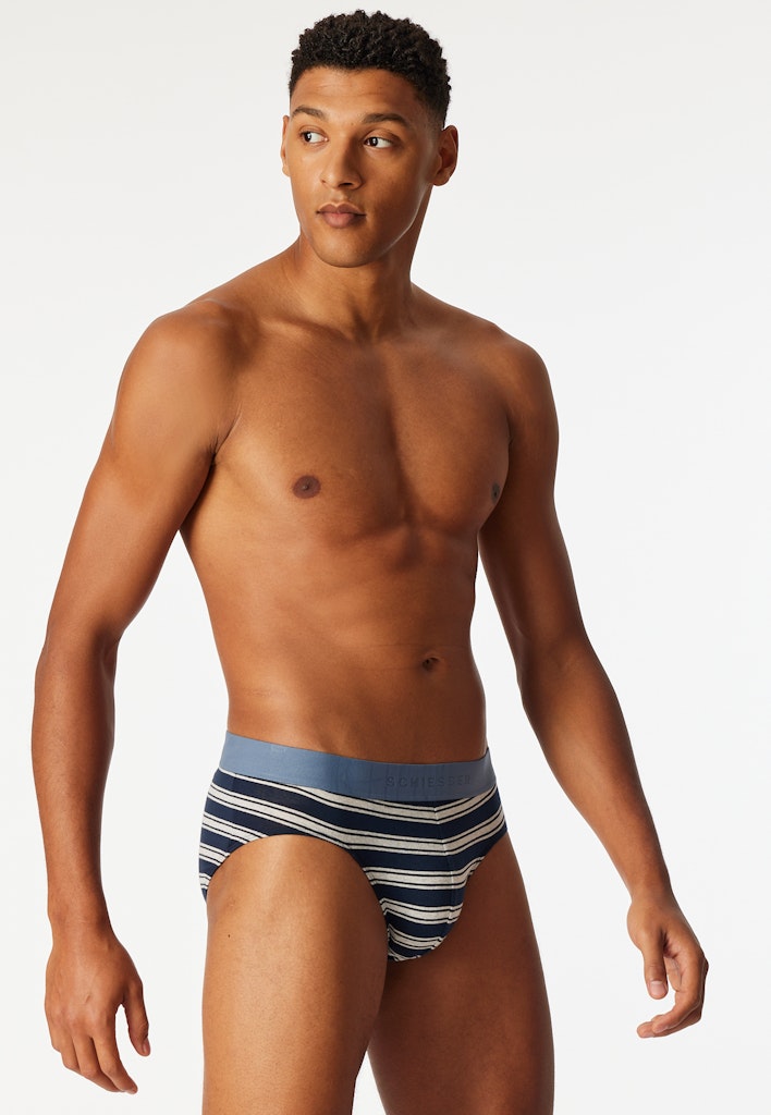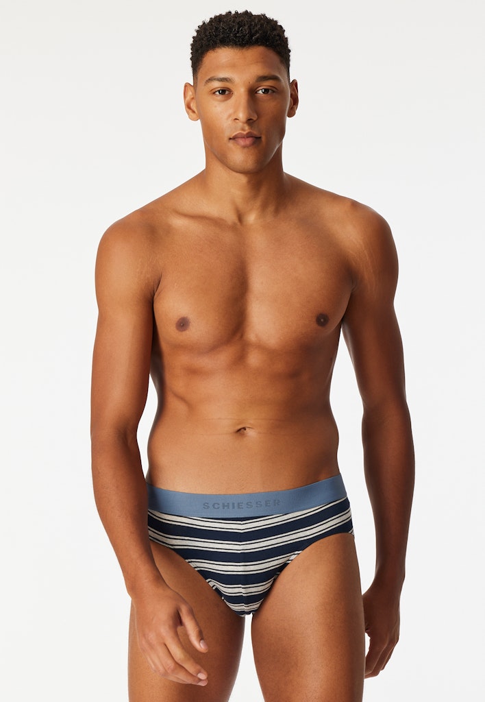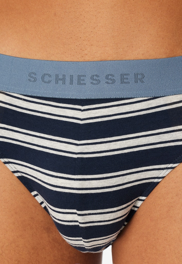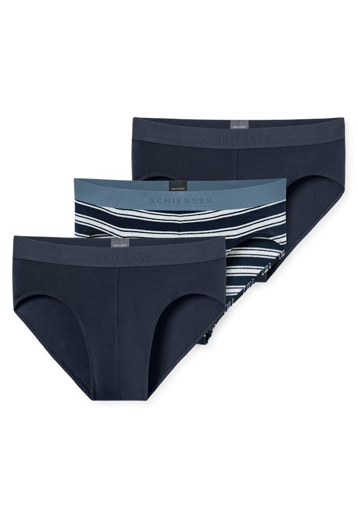 dunkelblauer Herren-Rio-Slips im 3er-Pack (2x unifarben, 1x blaugestreift), aus der beliebten SCHIESSER Serie "95/5", dunkelblauer, angenehm softer Logo-Webgummibund, bequeme Beinausschnitte und ohne störende Nähte, angenehm weich und formstabil dank 95% natürlichem Organic Cotton und 5% Elastan, unsere Models tragen Größe 50/M, in perfekt sitzender, elastischer Single-Jersey-Qualität