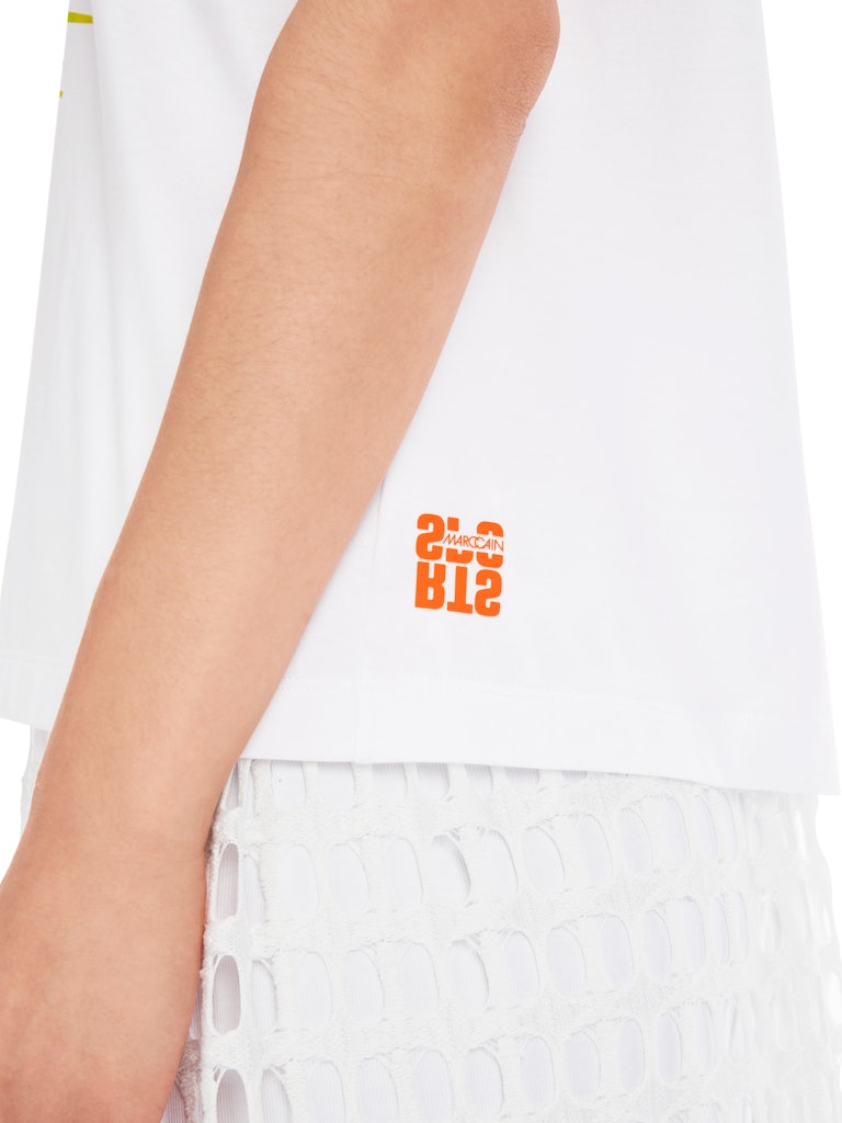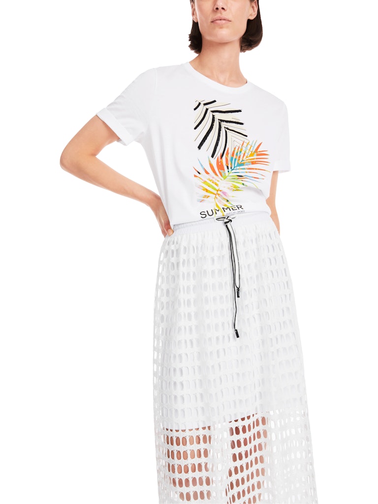 "Rethink Together" T-Shirt mit Print|Das bunte 3D-Palmblatt-Dessin auf der Vorderseite dieses T-Shirts ist ein interessanter Blickfang. Ergänzt wird der Look durch den "Summer"-Schriftzug. Das T-Shirt hat einen lockeren Schnitt mit Rundhals. Mit seiner soften Bio-Baumwolle trägt es das Nachhaltigkeitslabel "Rethink Together".|Lockerer Schnitt|Palmblatt-Dessin|Rethink Together|Softe Bio-Baumwolle|Das Model ist 179 cm groß und trägt N3/38.