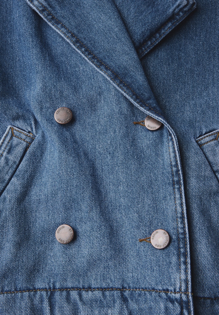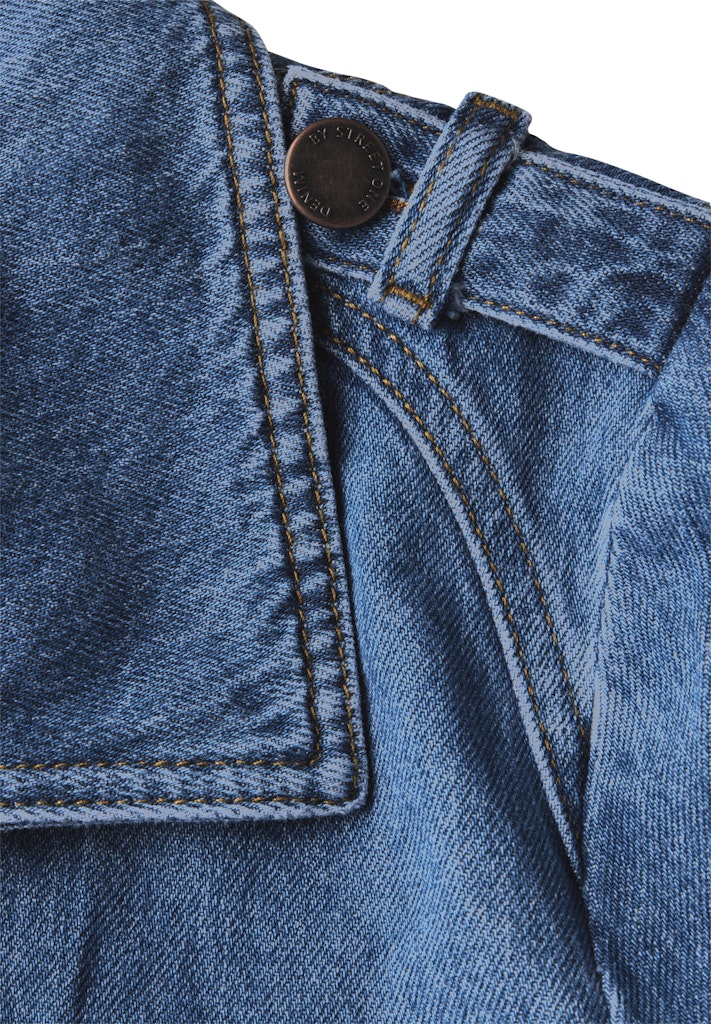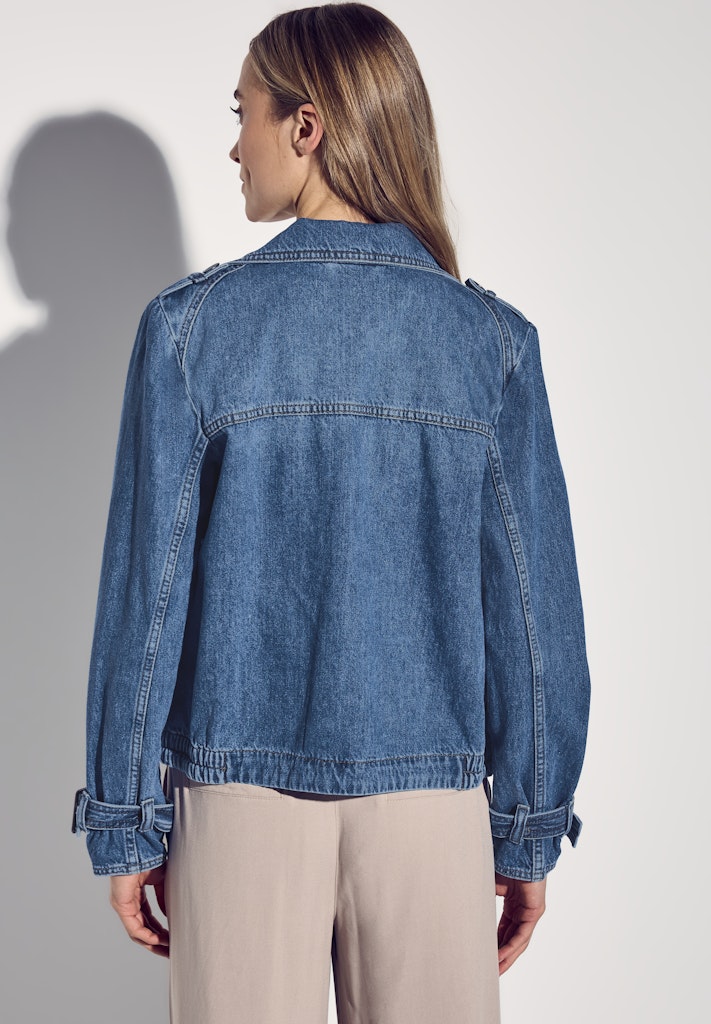 Die kurze Jeansjacke von Street One für Damen ist ein Statement Piece im Trenchcoat-Look. Der Reverskragen, die langen Ärmel und die Knöpfe unterstreichen die Trenchcoat-Optik, während die blaue Waschung und der elastische Saum eine lässige Denim Note ergänzen. Gefertigt aus reiner Baumwolle, ist die Jacke angenehm zu tragen. Jacke im Trenchcoat Look Reverskragen Langarm Seitliche Taschen Reine Baumwolle Material: 100% Baumwolle