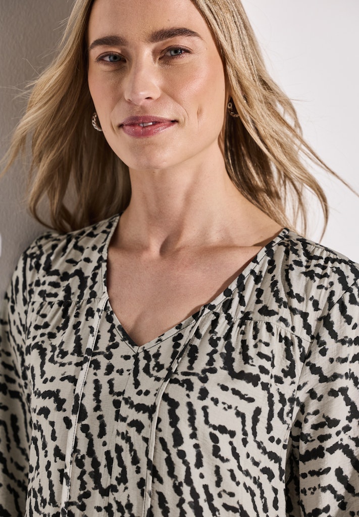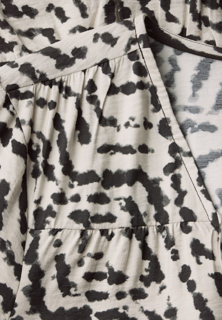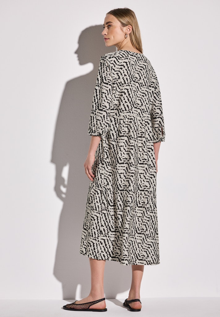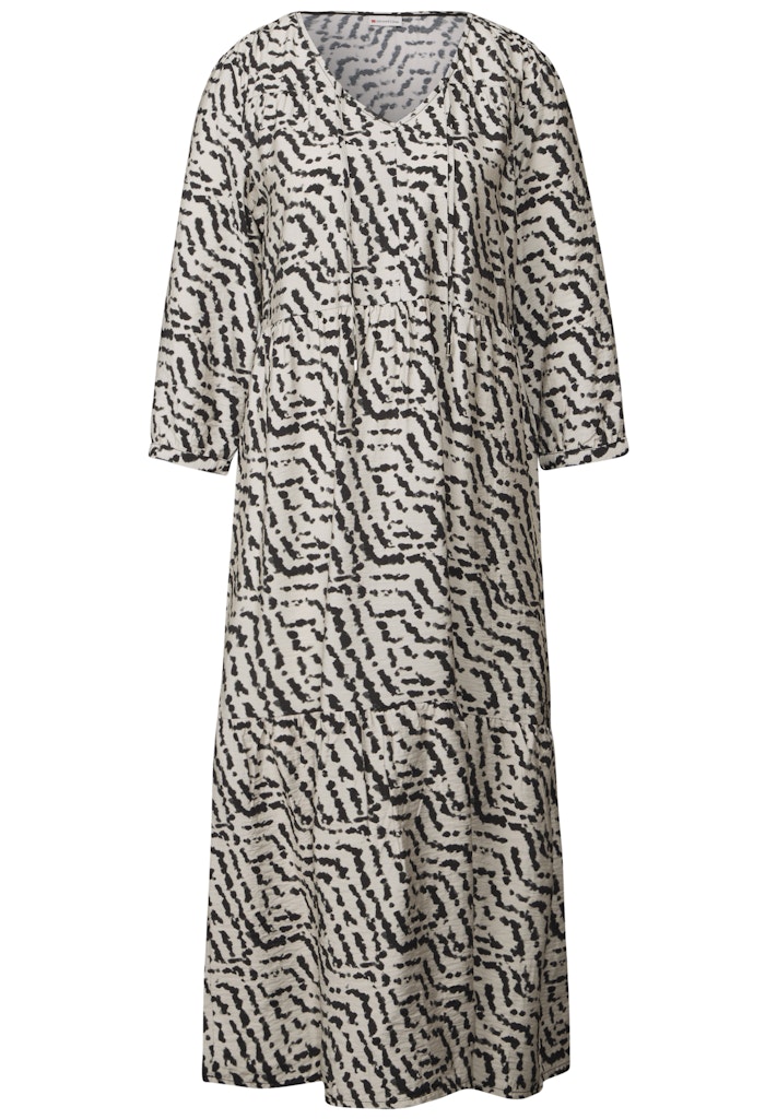 Ein grafisches Muster und weich fallende Volants machen dieses Midi Tunika-Kleid von Street One für Damen zum Hingucker. Der V-Ausschnitt mit Schnürdetail und die 3/4-Ärmel mit Bündchen verleihen dem Look eine feminine Leichtigkeit. Die fließende Qualität sorgt für ein angenehmes Tragegefühl. Gemustertes Midi-Kleid V-Ausschnitt mit Schnürdetail 3/4-Arm mit Bündchen Grafisches Muster Weich fallende Volants Material: 88% Viskose, 12% Polyamid
