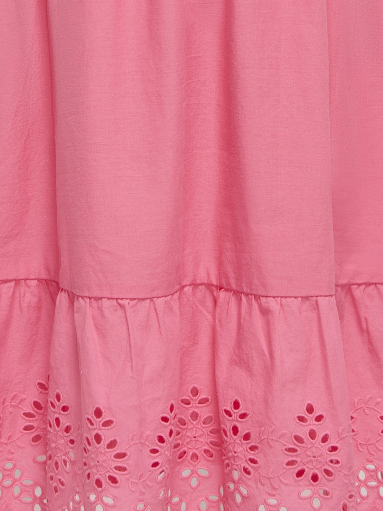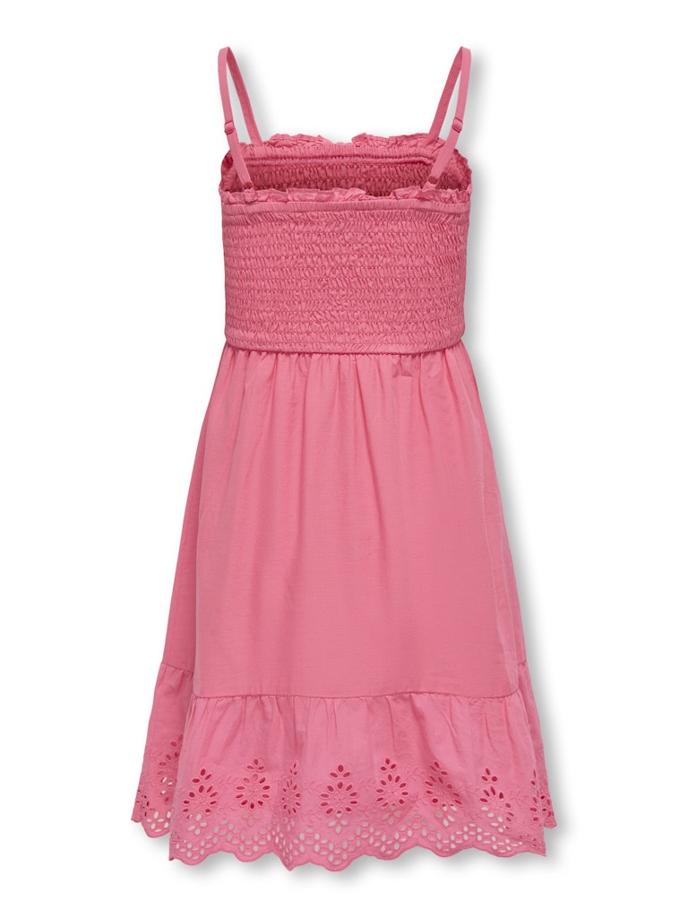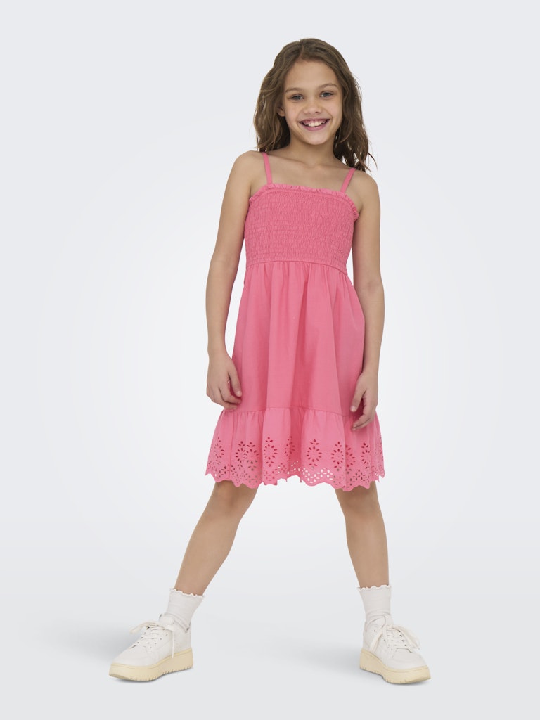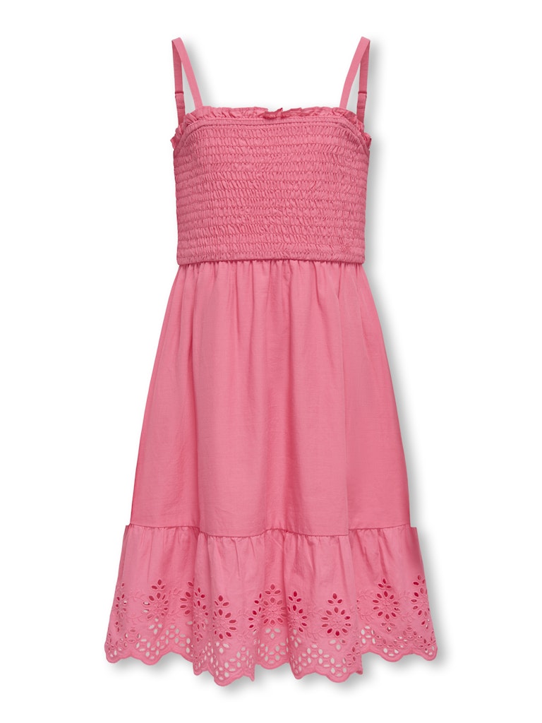 Werte deine Garderobe mit einem stylishen Kleid auf und kreiere einen umwerfenden Look, der zu jedem Anlass und jeder Jahreszeit passt.KIDS ONLY ist ein Modelabel für coole Kinder. Entdecke eine Welt, die voller Must-haves aus Denim, cooler Streetwear und stylisher Favoriten steckt. - Produkttyp : Kleid - Hals : Trapezausschnitt - Ärmel : Ohne Ärmel - Riemen : Schmale Träger, Verstellbare Träger - Länge/Größe : Midi-Länge - Details : Bestickt, Gesmoktes Detail - Passform : Slim Fit