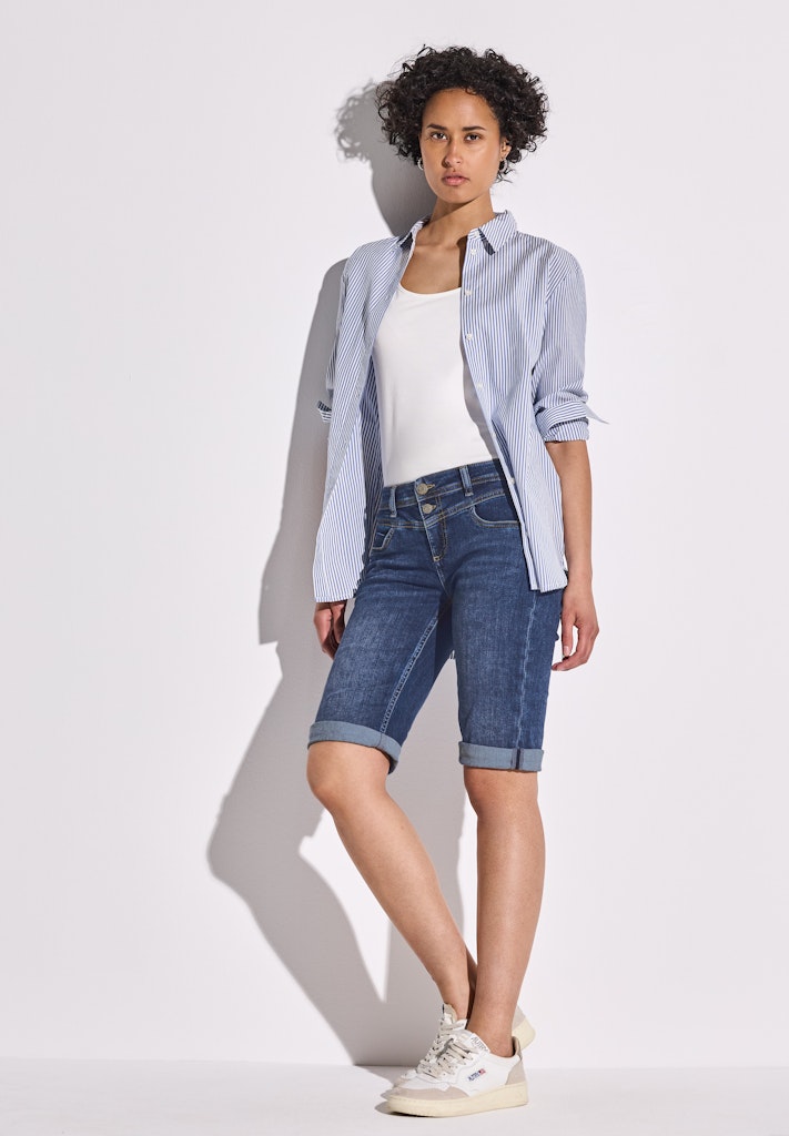 Die Bermuda Jeans von Street One für Damen im Casual Fit begeistert mit Slim Legs und einer modischen Mid Waist. Die blaue Waschung und der klassische 5-Pocket-Stil machen sie zum perfekten Begleiter für sommerliche Looks. Der Baumwollmix mit Stretchanteil sorgt für ein angenehmes Tragegefühl. Jeansshorts im Casual Fit Mid Waist und Slim Legs 5-Pocket Blaue Waschung Baumwollmix mit Stretchanteil Material: 79% Baumwolle, 15% Polyester, 4% Elastomultiester, 2% Elasthan