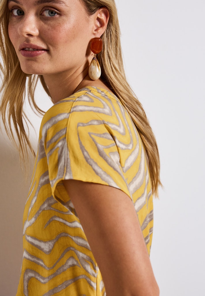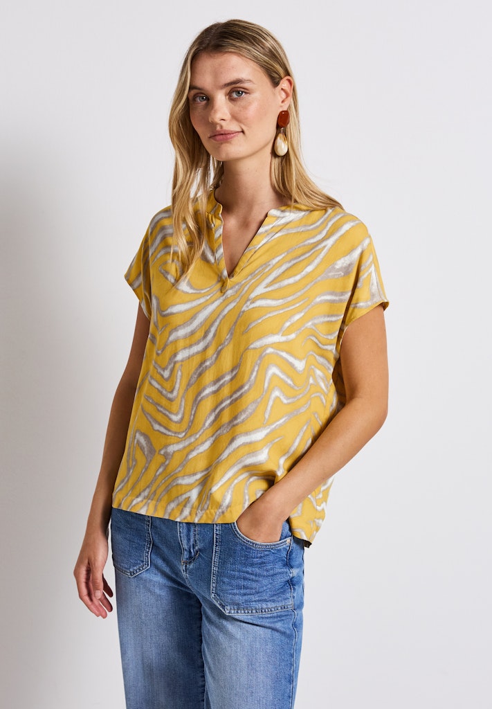 Diese Sommerbluse von Street One für Damen begeistert mit einem grafischen Muster und fließender Viskosequalität. Der geschlitzte Ausschnitt und die lockeren Dropped Shoulders sorgen für eine moderne Silhouette. Ein luftiges Lieblingsstück für feminine Everyday-Looks. Sommerbluse Geschlitzter Ausschnitt Dropped Shoulders Grafisches Muster Weiche Viskose Material: 100% Viskose