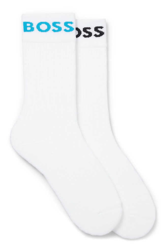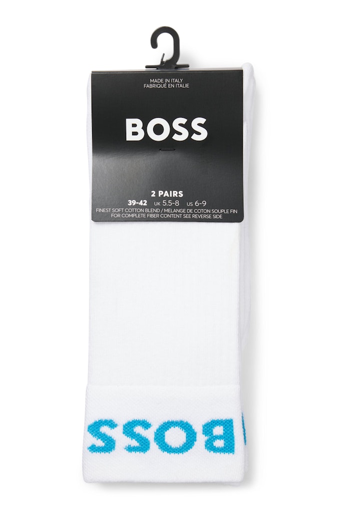 Zwei Paar charakteristische BOSS Socken. Die zeitgemäßen kurzen Socken aus einem elastischen Baumwoll-Mix sind weich gepolstert und versprechen hohen Tragekomfort. Eine spezielle Struktur und kontrastfarbene Logos runden die Styles ab.