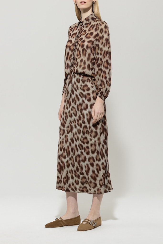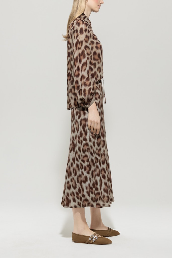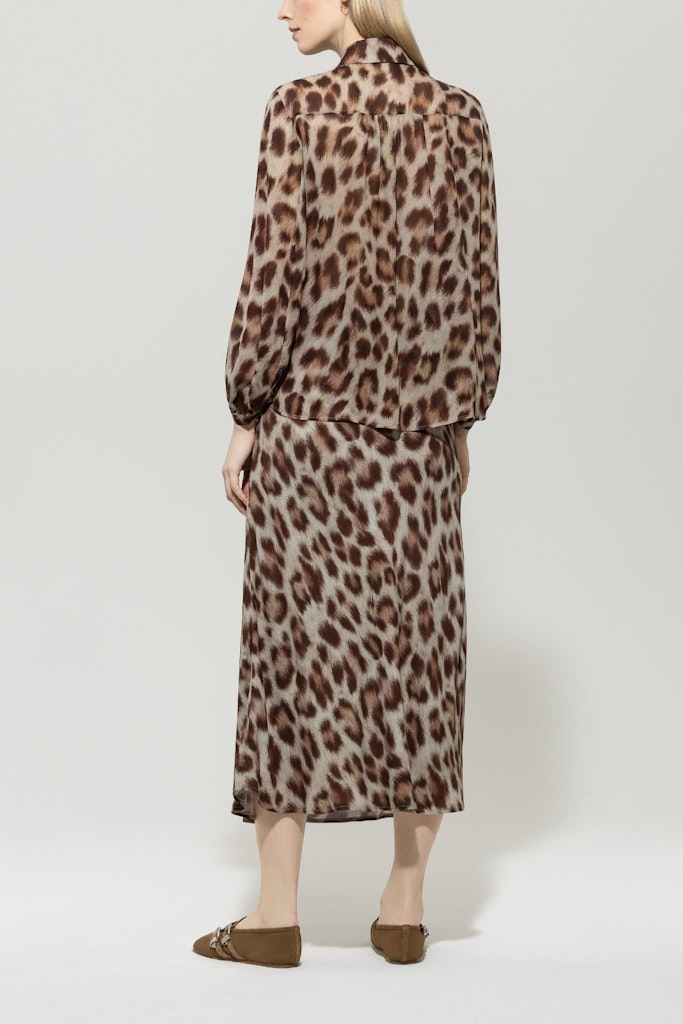 Hemdbluse aus semitransparentem Viskose-Crêpe mit exklusiv entwickeltem Animal-Dessin und leicht aufgebauschten Ärmeln. Die durchgehende Knopfleiste ist zusätzlich mit Bindebändern ausgestattet. Der abgerundete Saum ist seitlich geschlitzt.