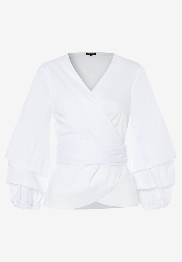 Die super-moderne Wickelbluse von MORE & MORE mit extraweiten 3/4 langen Ballonärmeln können Sie zur verwaschenen Jeansshorts genauso gut tragen wie zur weiten Marlenehose oder zum sommerlichen Printrock.