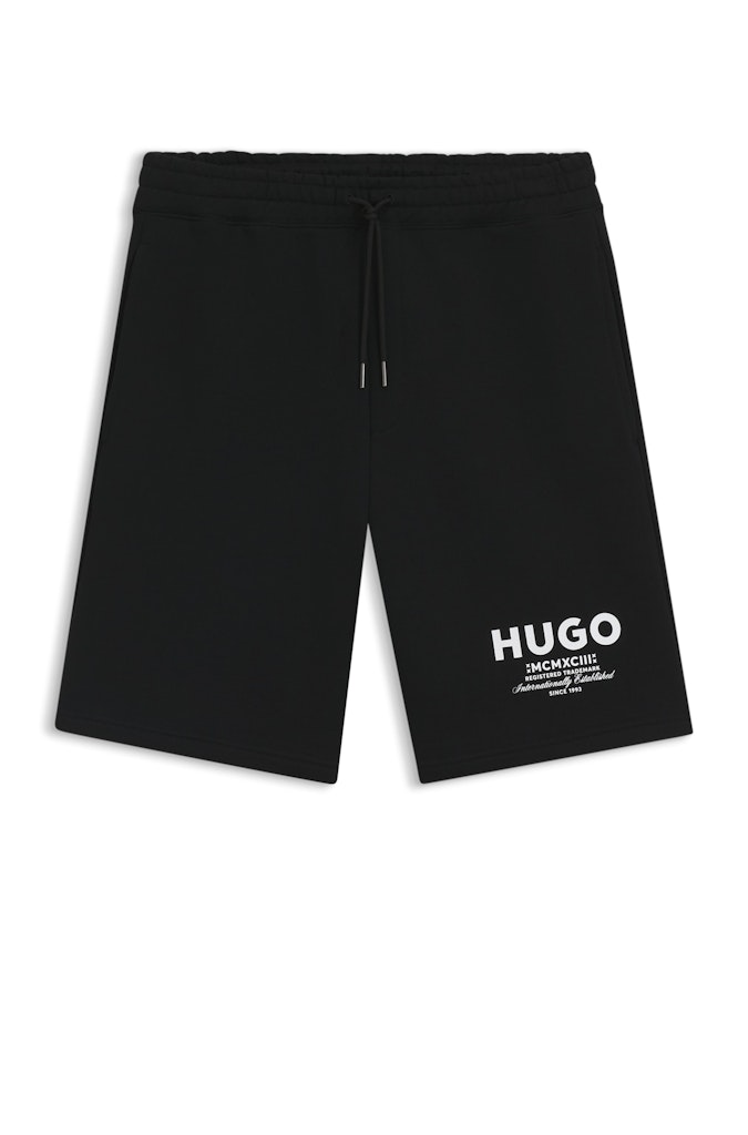 Sportive HUGO Shorts aus schwerem Baumwoll-French-Terry. Lockere Passform mit Tunnelzug am elastischen Bund. Blauer Logo-Print.