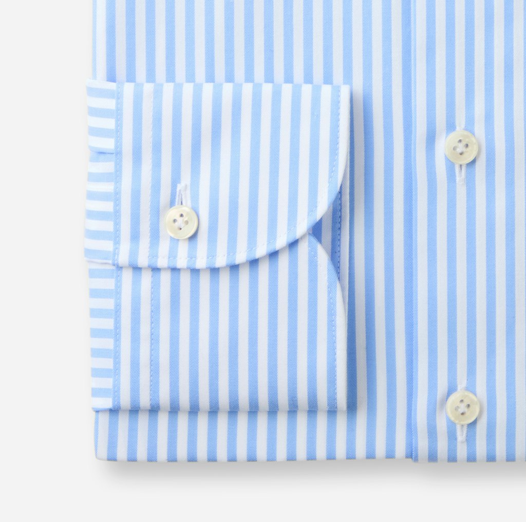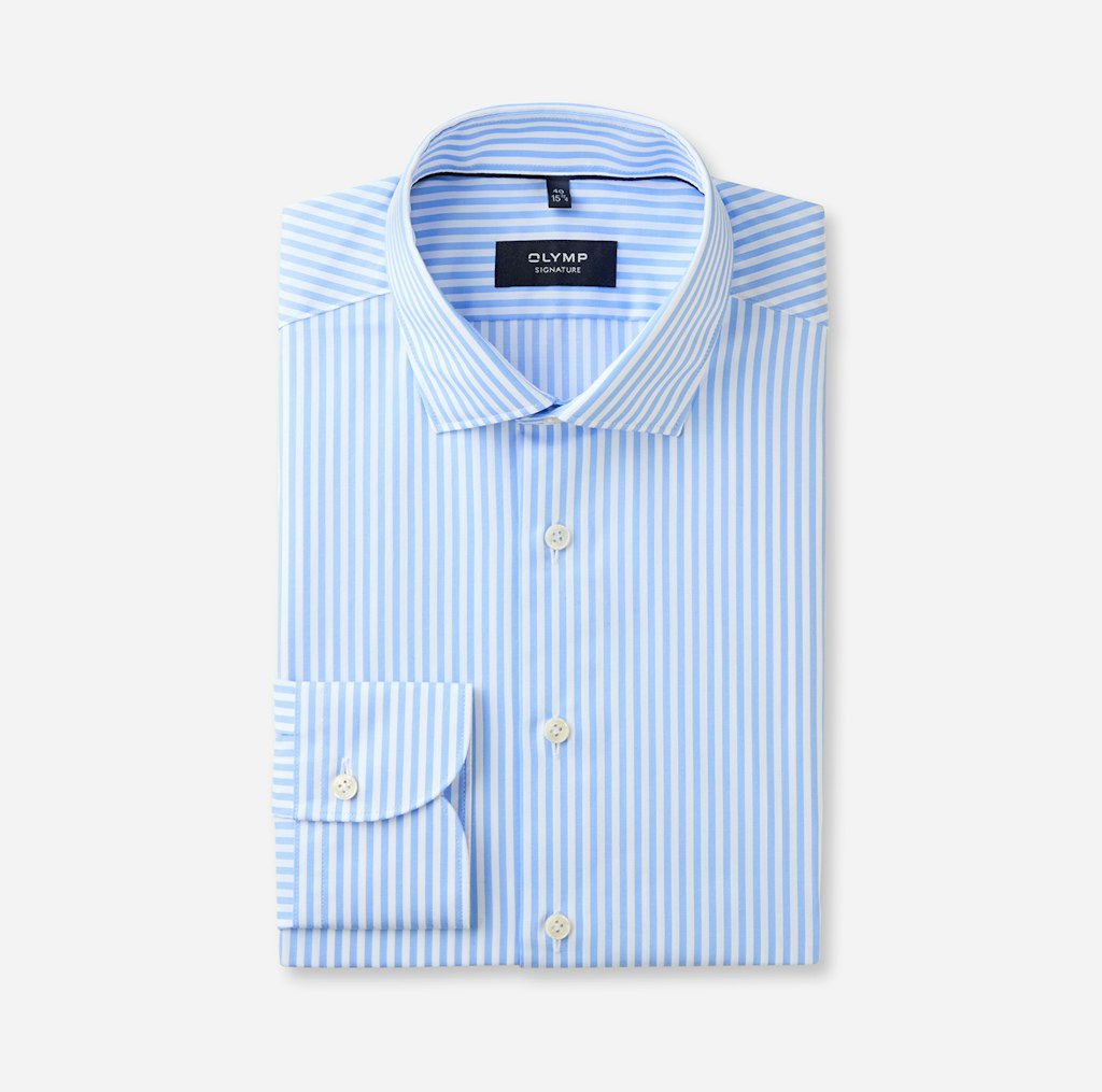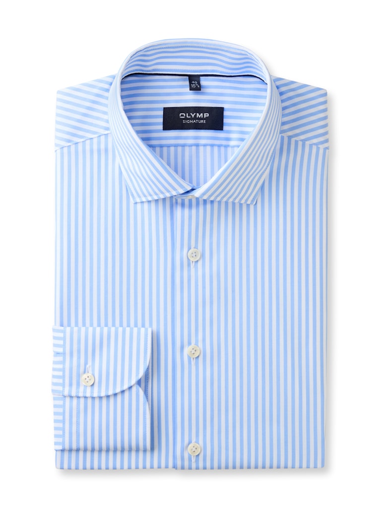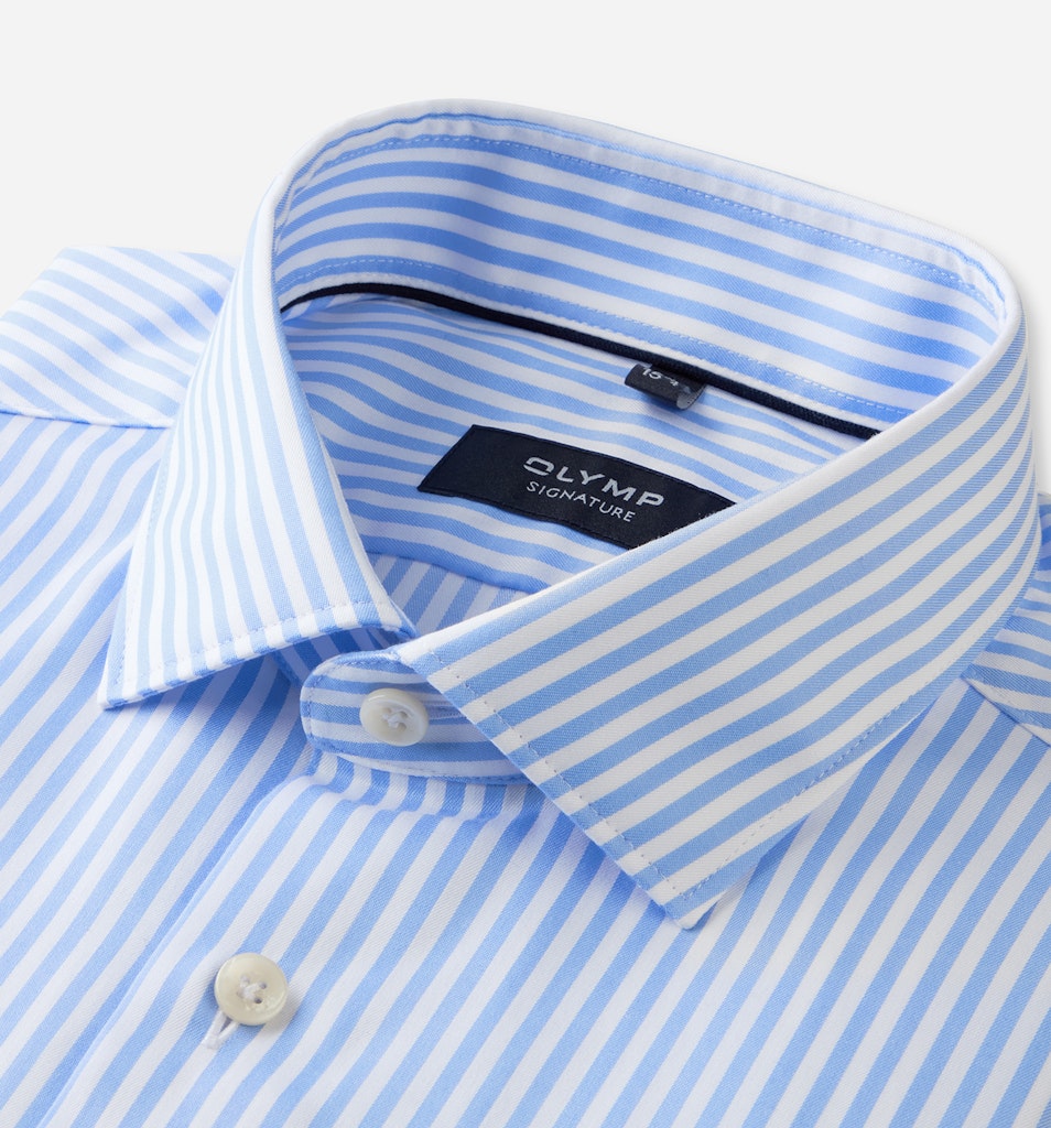 Bei diesem exquisiten Streifenhemd treffen die bewährten OLYMP SIGNATURE Standards auf innovative Neuerungen. Die extra-feine Qualität aus herausragender Two-Ply Premium-Baumwolle wurde einem speziellen Garment-Wash-Verfahren unterzogen und begeistert durch weiche Textur bei zugleich lässig-elegantem Charakter. Der segmenttypische Tailored Fit gewährt auch hier hervorragende Passform, perfektioniert durch eine differenzierte Schulterkonstruktion und den akkurat gearbeiteten SIGNATURE Kent-Kragen. Mit hochwertiger Knitterfrei-Ausrüstung für makellose Performance auch an dynamischen Tagen. In der Variante Nachtblau mit erhöhter Blickdichte. OLYMP SIGNATURE. Das Hemd, das sich trägt wie kein anderes.