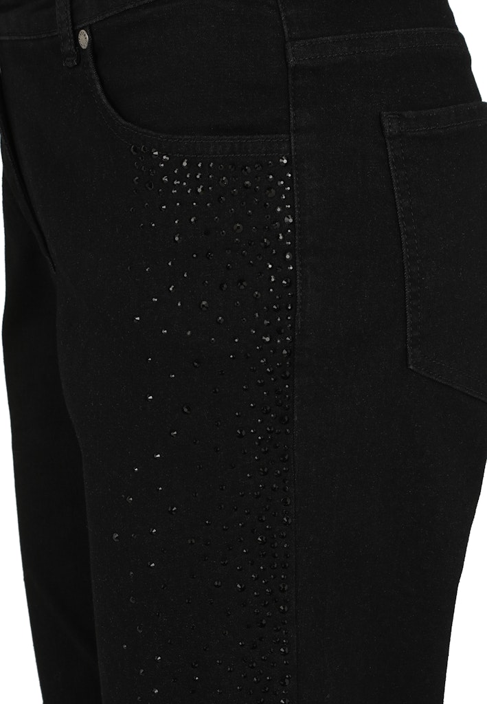 Größe schlanker wirken und sorgt für eine schöne Silhouette. Abgerundet wird das Modell mit klassischen 5-Pocket Taschen und tonigem schwarzem Strass. In angesagt dunkler Waschung.