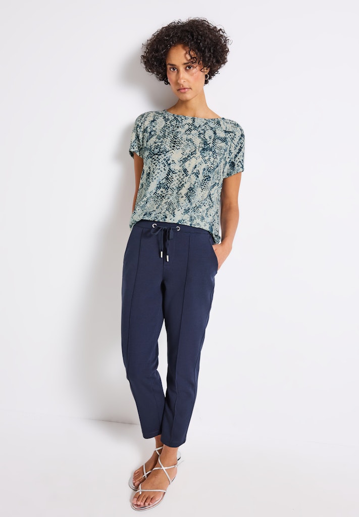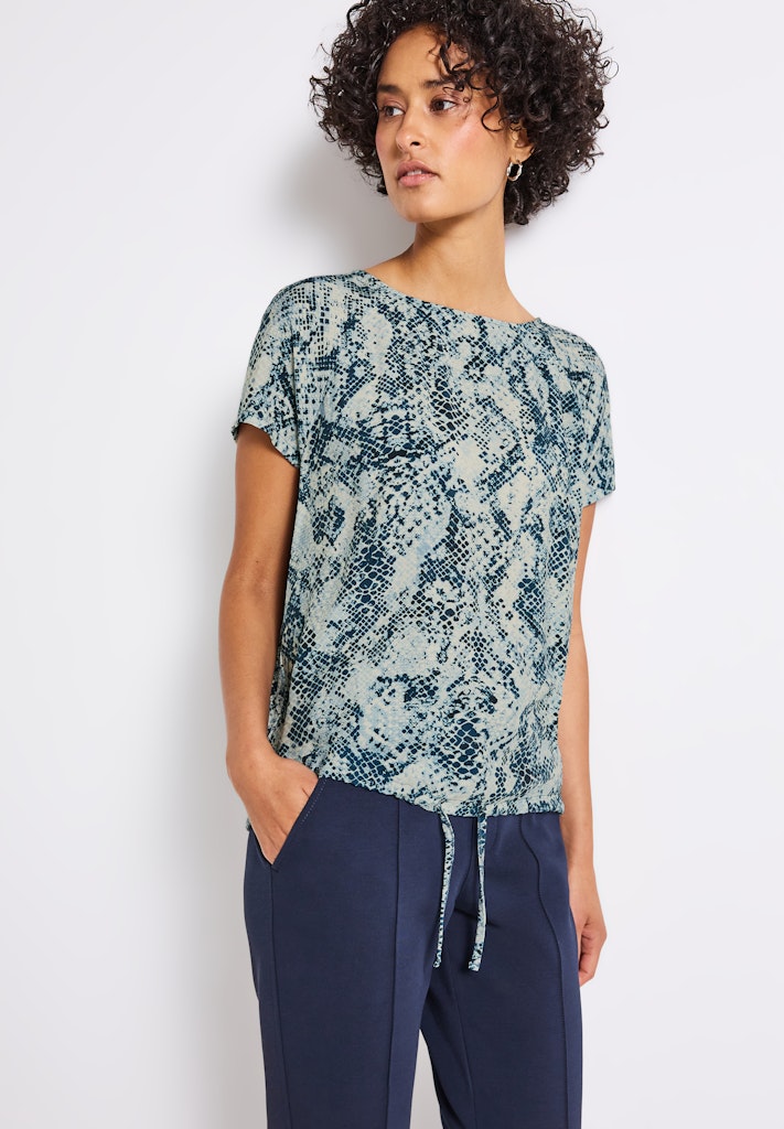 Dieses Sommershirt von Street One für Damen kombiniert eine Vorderseite aus zartem Blusenstoff mit einer Rückseite aus weichem Jersey. Der U-Boot-Ausschnitt, dropped shoulders und ein Tunnelzug am Saum verleihen dem Shirt eine moderne Passform. Perfekt für sommerliche Casual-Looks mit Stil. Sommershirt mit Tunnelzug am Saum U-Boot-Ausschnitt Dropped Shoulders Vorderseite aus leichtem Blusenstoff Rückseite aus softer Jersey-Qualität Material: Vorderseite: 84% Viskose, 16% Polyamid; Rückseite: 95% Viskose, 5% Elasthan