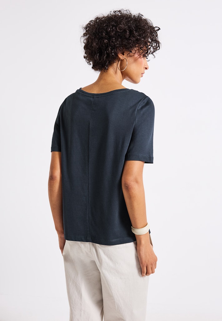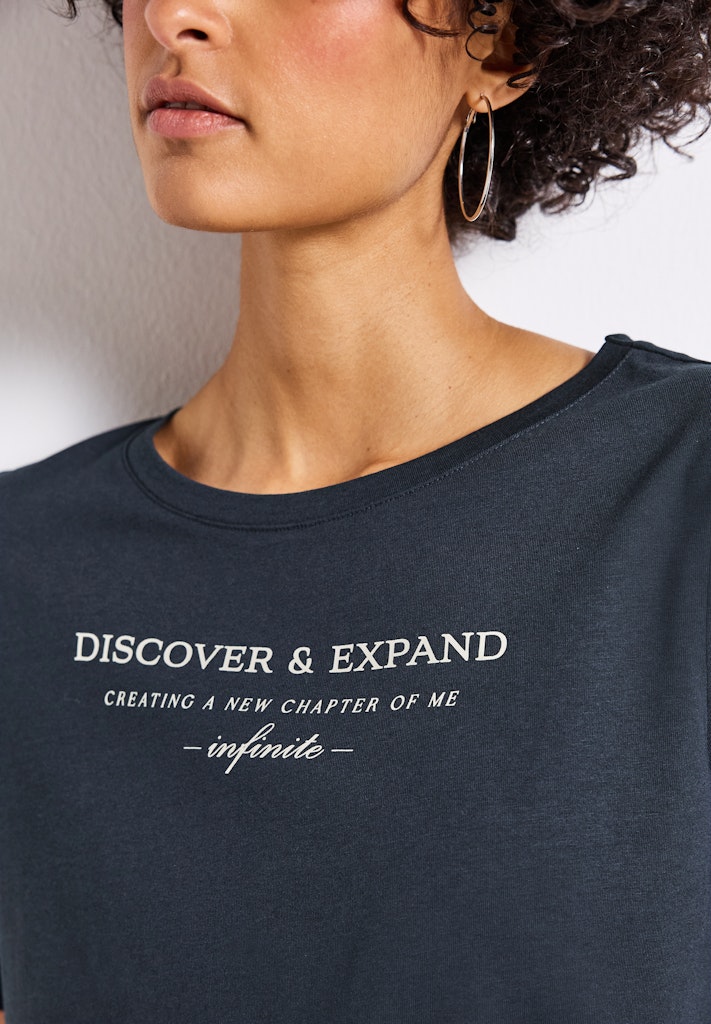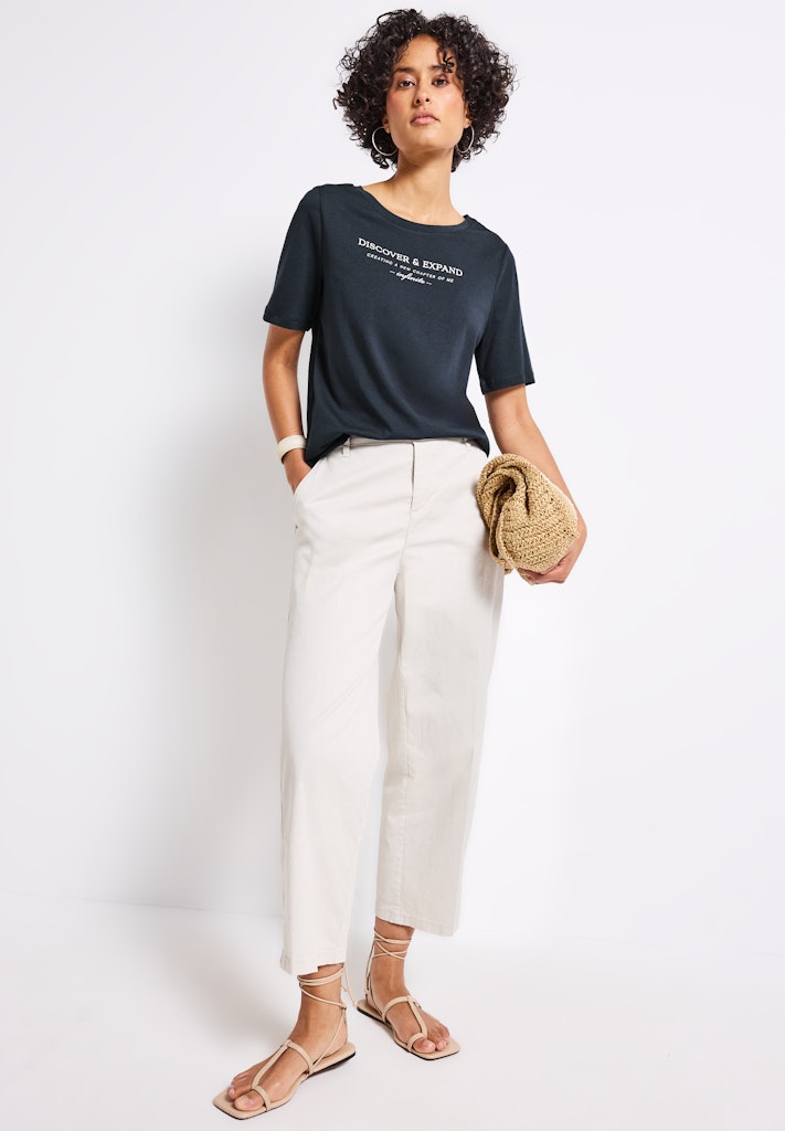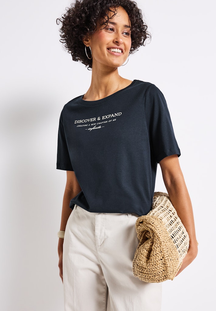 Dieses Kurzarmshirt von Street One für Damen ist ein Basic mit besonderem Detail. Das Wording Artwork auf der Front setzt ein modisches Statement, während der weiche Baumwoll-Modalmix für hohen Komfort sorgt. Ein vielseitiger Stylingpartner für entspannte Casual-Outfits. Kurzarmshirt Rundhalsausschnitt Wording Artwork Softer Baumwoll-Modalmix Material: 50% Baumwolle, 50% Modal