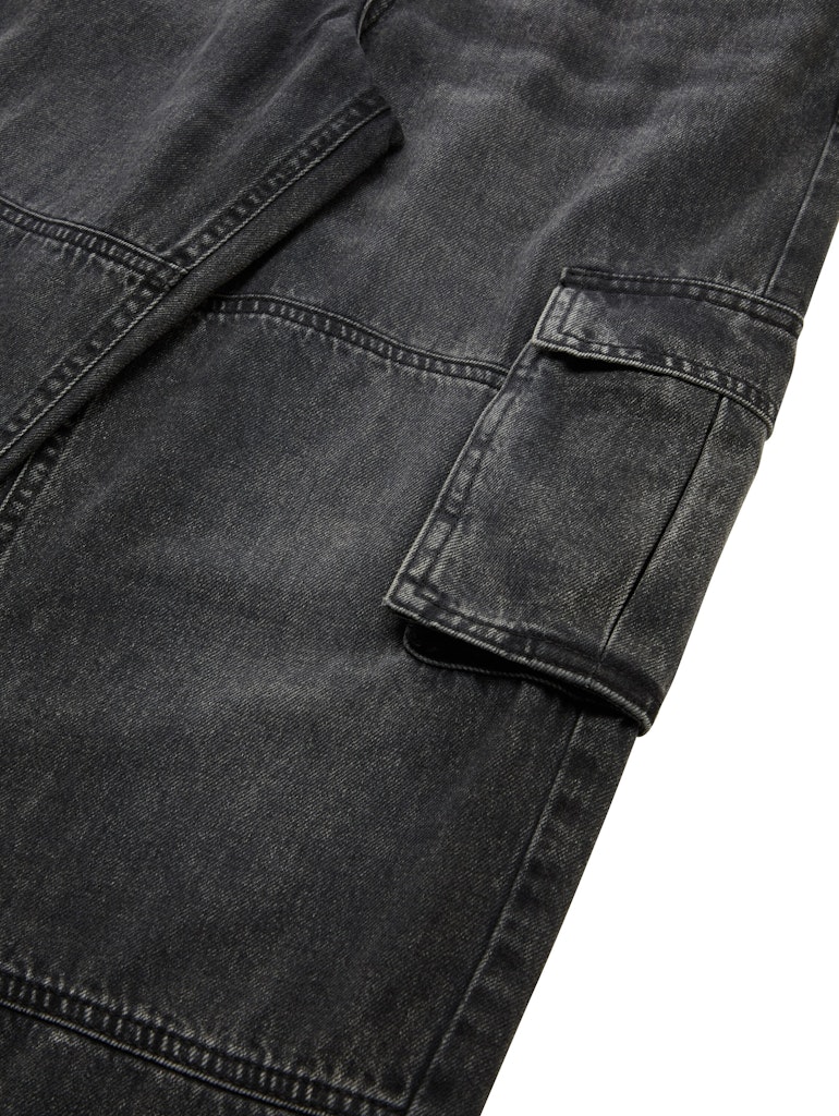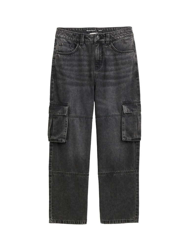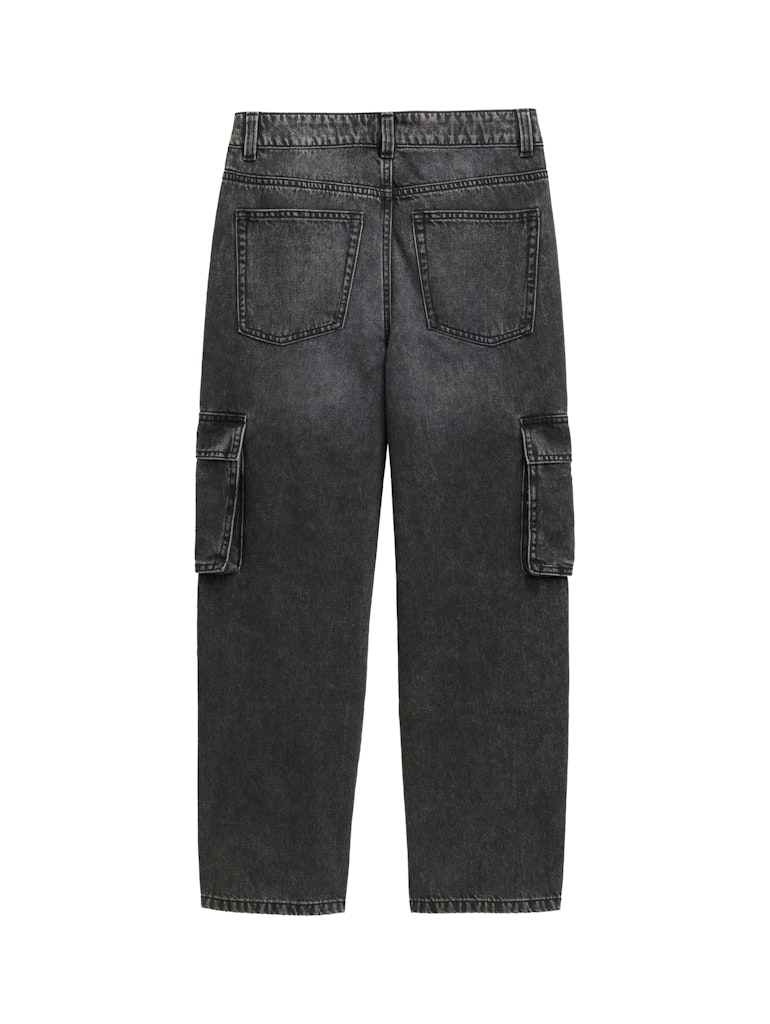 * Weite Jeanshose mit Cargo-Taschen am Bein, seitlichen Eingriffstaschen vorne und aufgesetzten Taschen hinten. Mit elastischem Band im Hosenbund zum flexiblen Verstellen der Weite.