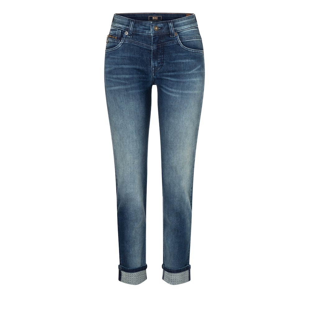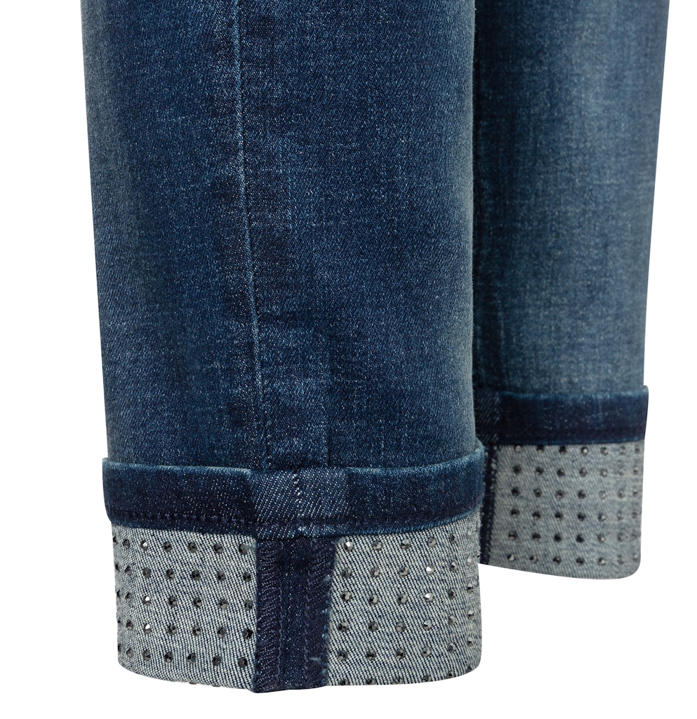 Slim Fit, Slim Leg, schmales, gerades Bein, mittlere Leibhöhe, Five Pocket, umgeschlagener Saum mit glamourösen Strasssteinen, sportive Naht-Details, Light Authentic Denim, sehr hautfreundliche, atmungsaktive Ganzjahres-Qualität mit Modal, leicht im Gewicht, soft im Griff, gefärbt im Indigo Flow-Verfahren für weniger Einsatz von Wasser, Chemie und Farbstoff, authentische Optik, hoher Tragekomfort, Das Model ist 1,75m groß und trägt die MAC Hosengröße 36, Fußweite bei Größe 36: 30cm