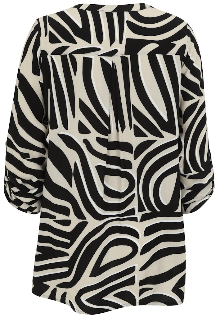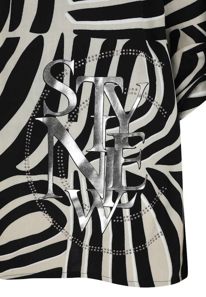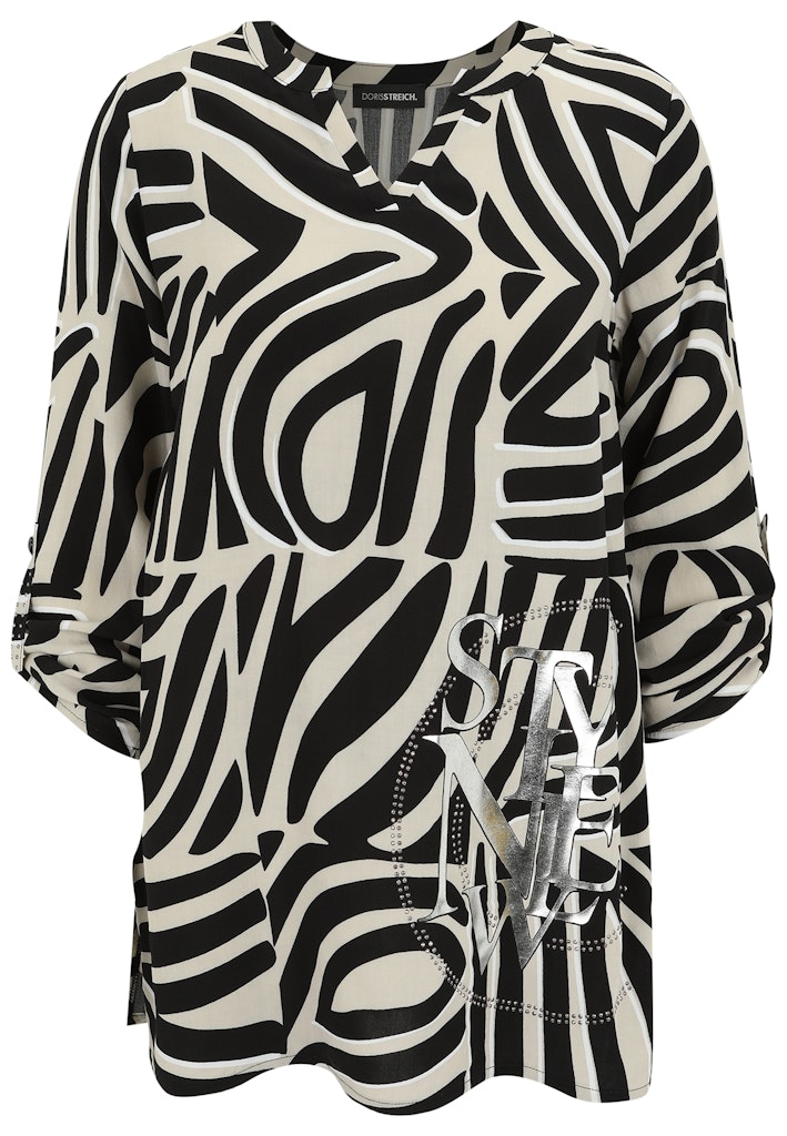 Diese lässige Bluse von Doris Streich mit ihrem edlen sand-schwarz-weißen Grafik-Print ist aus softer Viskose gefertigt. Das große silberfarbene Motiv mit Metallplättchen ist ein Hingucker. Die lässige A-Linie mit Falte im Rückenteil umspielt locker Ihre