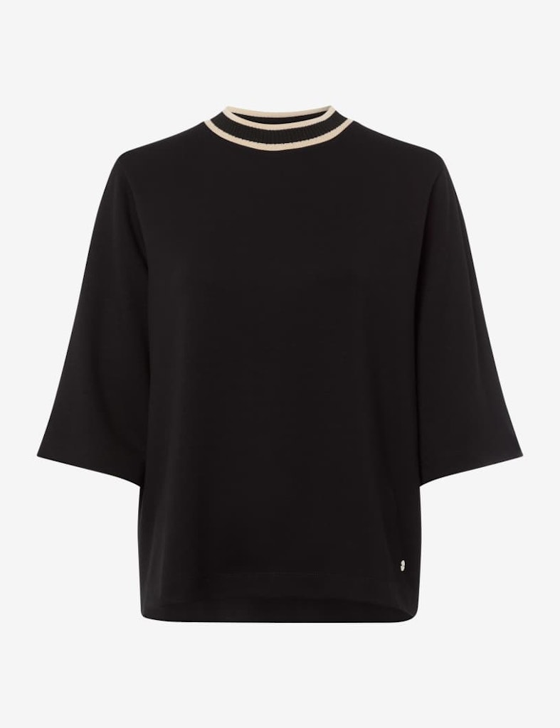 Perfekt für die Herbst- und Wintersaison, begeistert das Sweatshirt im Style BERTA mit einem raffinierten Stehkragen und einer modernen Silhouette, die durch entspannte Schultern, einer sanften Taillierung und weit geschnittenen Ärmeln eine harmonische Ausstrahlung erzeugt. Dezente Zierbänder am Kragen setzen geschmackvolle Akzente und unterstreichen den hochwertigen Look des Designs. Gefertigt aus hochwertigem Jersey, bietet dieses Oberteil ein unvergleichlich weiches Tragegefühl und gleichzeitig eine elegante Optik. Der Materialmix aus Viskose, Polyester und Elasthan sorgt für eine geschmeidige Haptik, besondere Formstabilität und eine angenehme Elastizität, die jede Bewegung mitmacht. Die Viskose verleiht dem Stoff einen natürlichen, seidigen Glanz, während der Polyesteranteil Strapazierfähigkeit garantiert. Ein Hauch Elasthan rundet das Material perfekt ab und schenkt zusätzlichen Komfort.