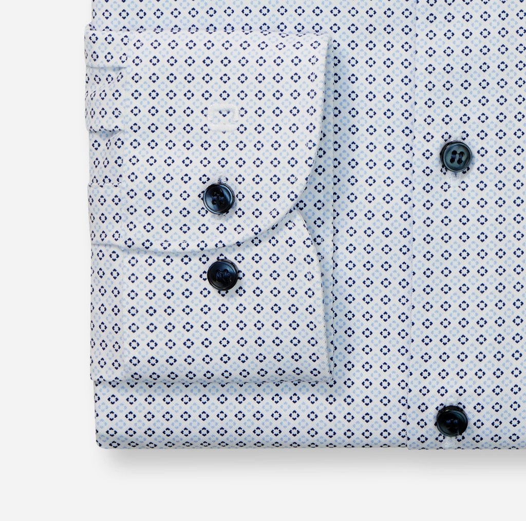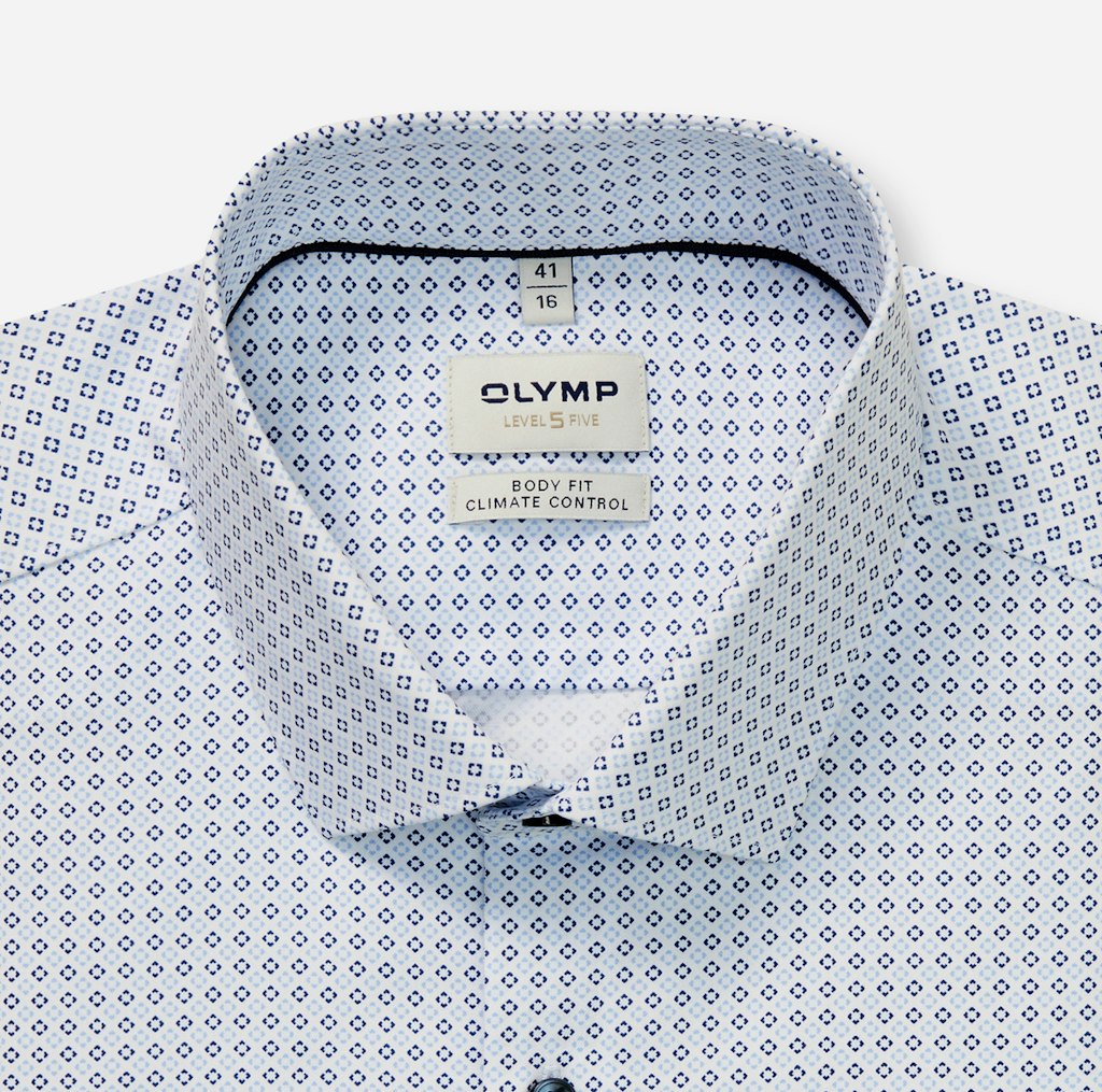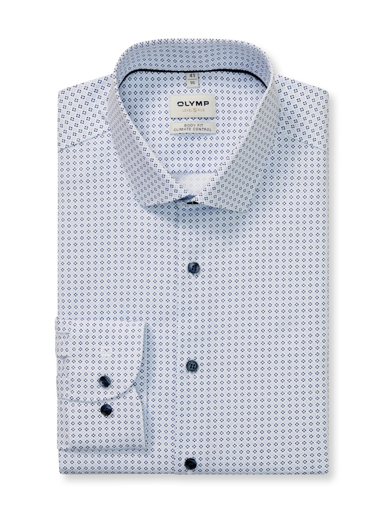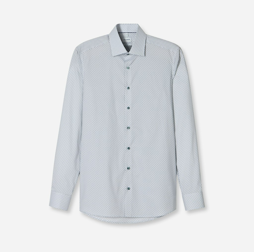 Sympathischer Office-Look mit dezentem Minimal-Dessin auf Weiß. Das körperbetonte OLYMP Level Five 24/Seven besticht durch modische, funktionale und trageangenehme Features. Der Climate-Control-Fasermix ist pflegeleicht, atmungsaktiv, dehnbar, schnelltrocknend sowie temperatur- und feuchtigkeitsregulierend. Smarter Modern Kent, lässig gerundeter Saum.