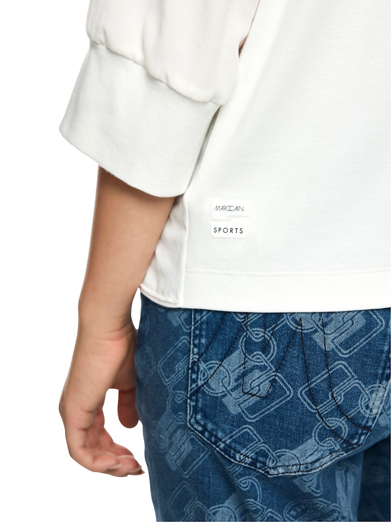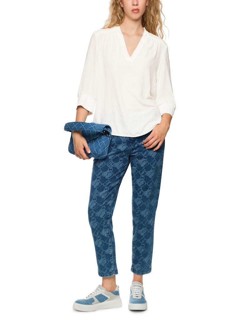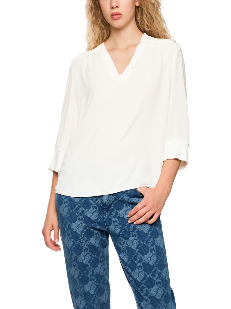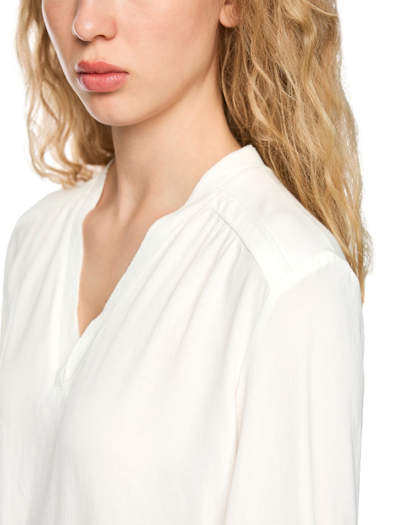 Blusenshirt aus Materialmix|Das fließende Blusenshirt ist vorne aus leichter Kunstfaser gefertigt, während das Rückenteil und die Ärmelbündchen aus Baumwollstretch in Ripp-Design hergestellt wurden. Der V-Ausschnitt präsentiert sich mit gedoppelter Kante. Der rollierte Saum und der kleine Sports-Cube setzen besondere Akzente.|Weit geschnitten|V-Ausschnitt|Rollierter Saum|Sports-Cube am Saum|Das Model ist 179 cm groß und trägt N3/38.