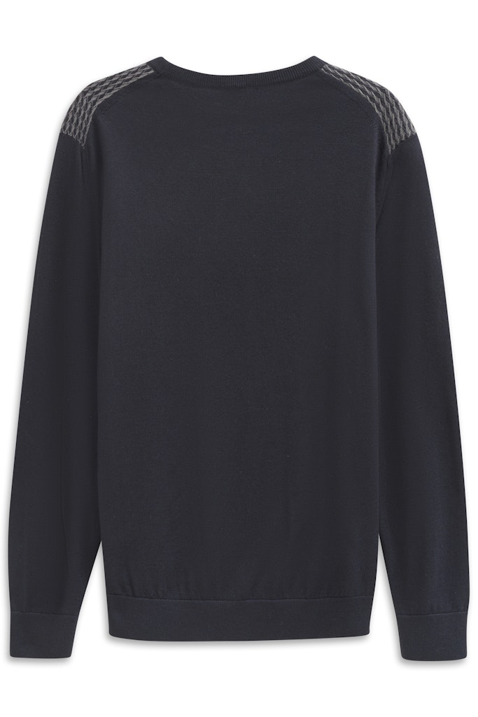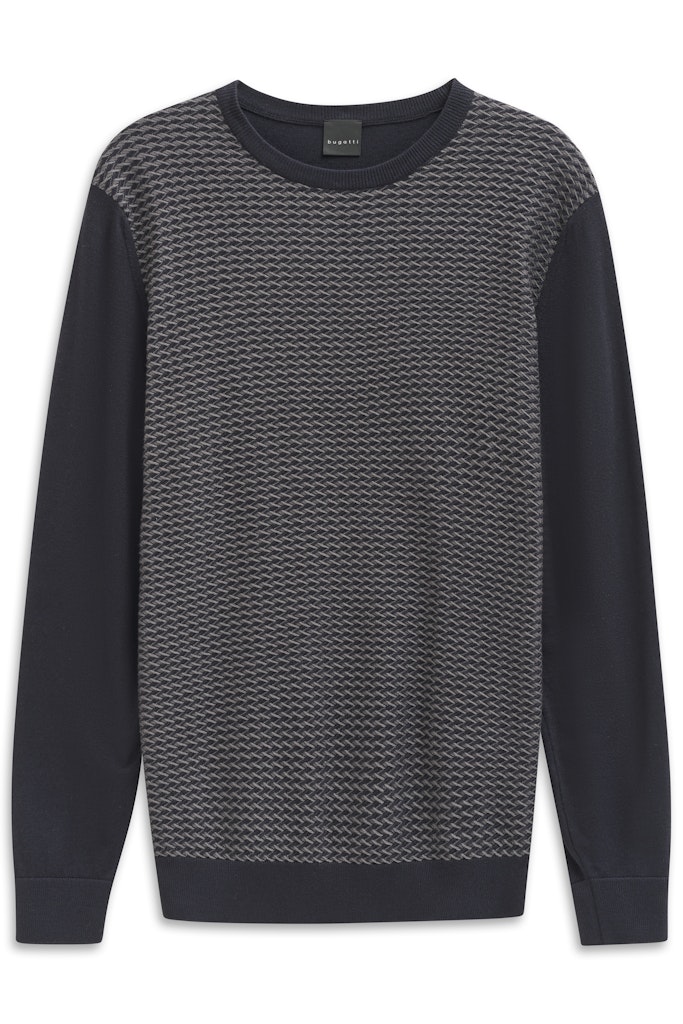 RH Pullover Front in 2-Tone Struktur, Rippbündchen an Ärmeln und Saum und bugatti Flaglabel an linker Seitennaht