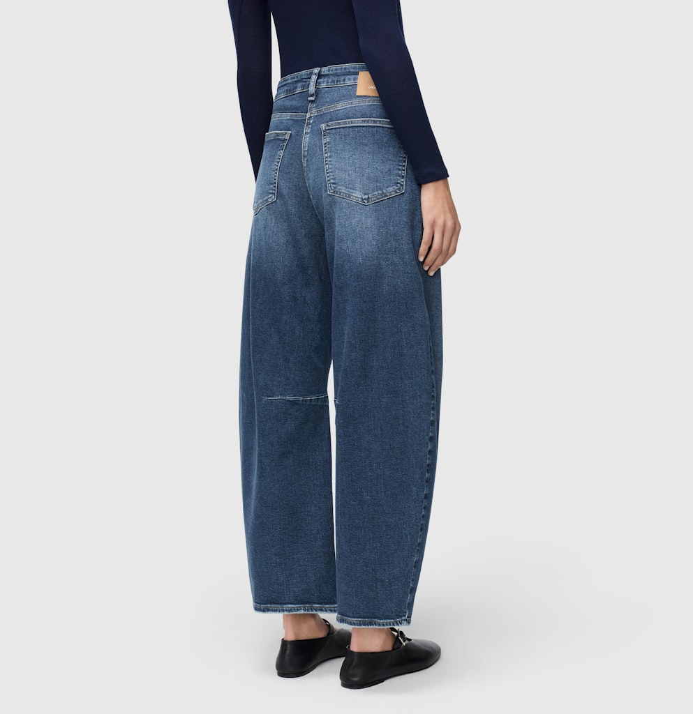 Barrel Fit, Barrel Leg, relaxtes Bein im O-Shape, hohe Leibhöhe, Five Pocket, bequemer, lockerer Sitz an Hüfte und Oberschenkel, Naht-Detail auf Kniehöhe, Authentic Comfort Stretch Denim, hochwertige, sehr elastische Qualität, authentische, strukturierte Optik, angenehmer Griff, moderner Vintage Look, hervorragende Passform, Das Model ist 1,75m groß und trägt die MAC Hosengröße 36, Fußweite bei Größe 36: 52cm