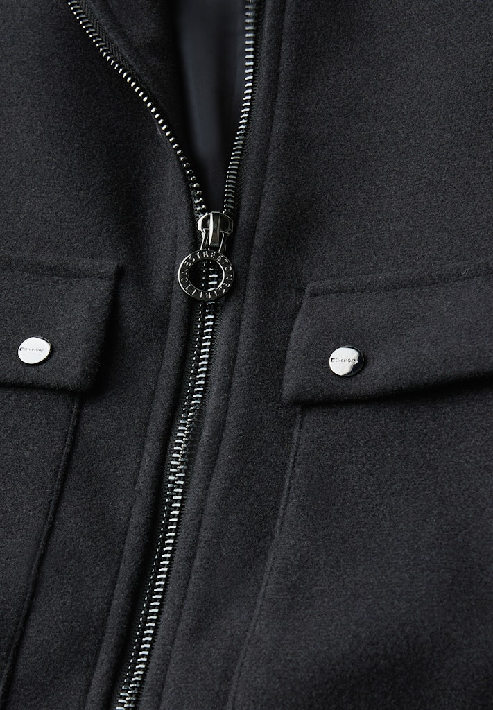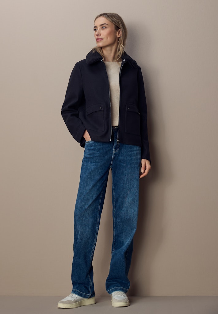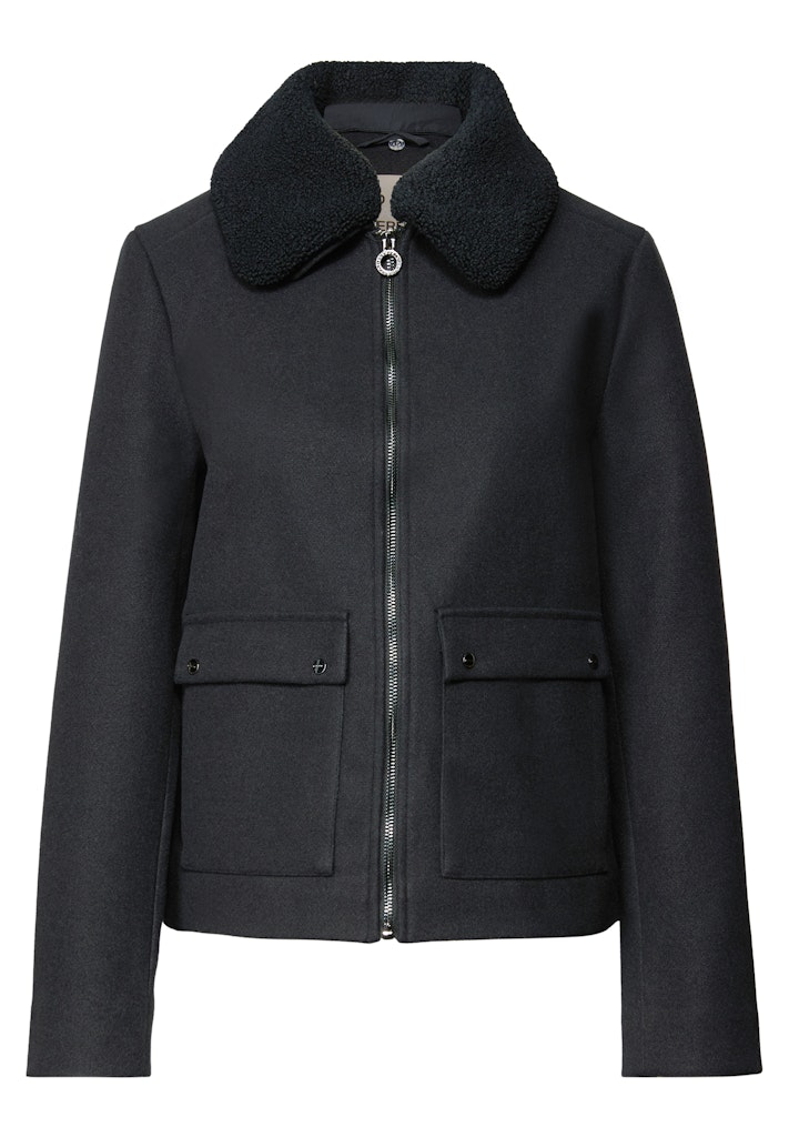 Diese kurze Jacke von Street One für Damen überzeugt mit einem modernen Look in Wolloptik und liebevollen Details. Der abnehmbare Teddy-Kragen setzt einen kuscheligen Akzent und verleiht der Jacke einen wandelbaren Charme. Aufgesetzte Taschen und ein praktischer Reißverschluss runden das Design funktional und stilvoll ab – ideal für feminine und bequeme Casual-Looks. Kurze Jacke Abnehmbarer Teddy-Kragen Aufgesetzte Taschen Reißverschluss Material in Wolloptik Material: 90% Polyester, 10% Viskose