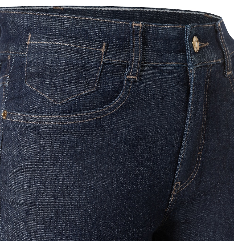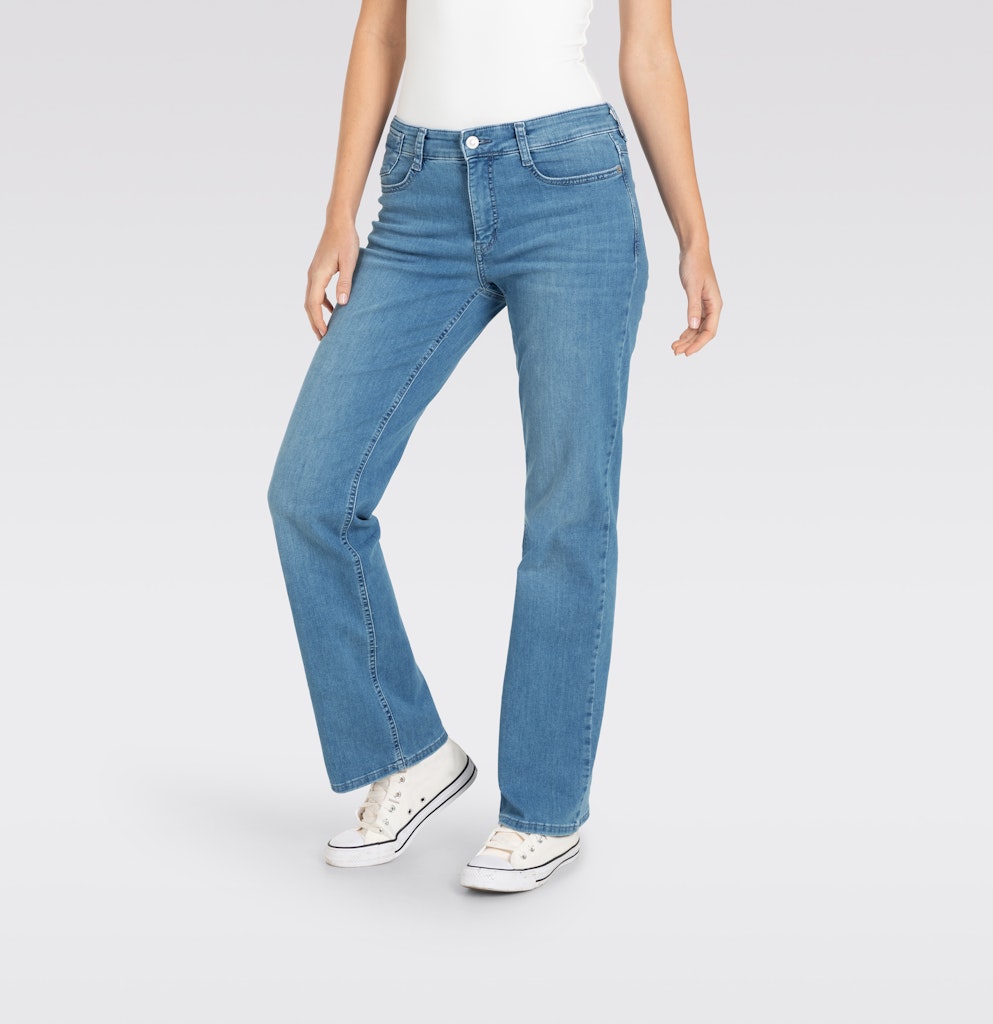 Flared Fit, Bootcut, gerades Bein, ausgestellter Saum, schlanke Silhouette, angezogene, erhöhte Leibhöhe, bequeme Taille, Five Pocket, modernes Naht-Detail an den Gesäßtaschen, Authentic Stretch Denim, sehr hochwertige, elastische Denim-Qualität, figurformender Effekt, hervorragendes Rücksprung-Verhalten, authentische Optik, angenehmer Griff, hoher Tragekomfort, Das Model ist 1,75m groß und trägt die MAC Hosengröße 36, Fußweite bei Größe 36: 46cm