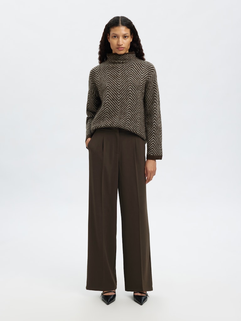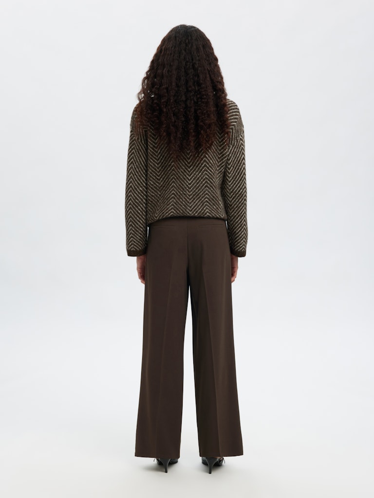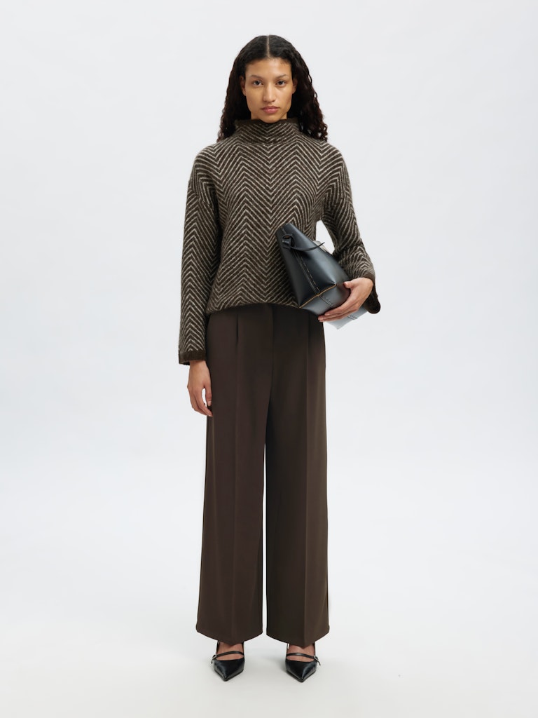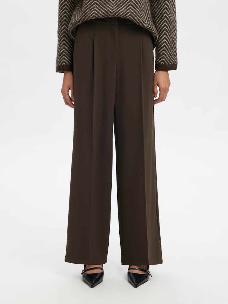 Hosen mit weitem Bein gehören zu den schmeichelhaftesten Silhouetten in deinem Kleiderschrank. Diese Hose mit Schlag hat einen mittelhohen Bund, betont deine Taille und lässt deine Beine optisch länger wirken. Die Hose punktet außerdem mit eleganten Tailoring-Details wie den Paspeltaschen am Gesäß, den Bügelfalten an der Beinmitte und den Bundfalten an der Vorderseite. Wie du sie trägst? Unser Tipp: Kombiniere sie im Büro mit einem gerippten Rollkragenpullover, einem einreihigen Blazer und spitzen Pumps.- Mid Waist- Reißverschluss mit Haken- und Ösenverschluss- Einschubtaschen an der Seite- Paspeltaschen am Gesäß- Bundfalten an der Vorderseite- Bügelfalten vorn und hinten an der Beinmitte- Vollfutter- Weite Beinform