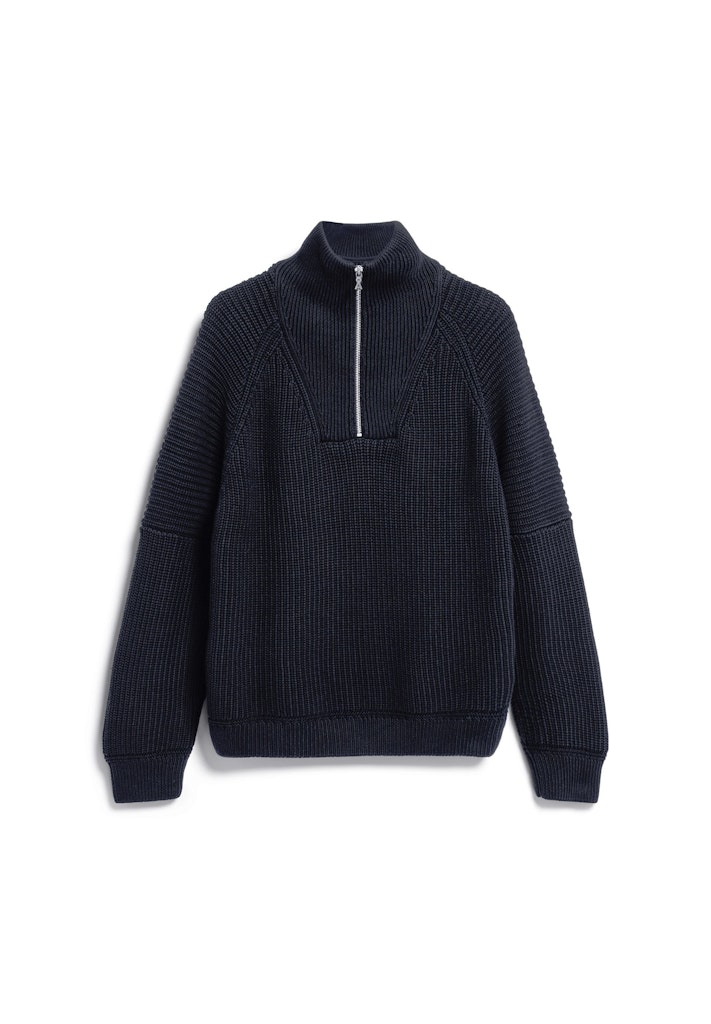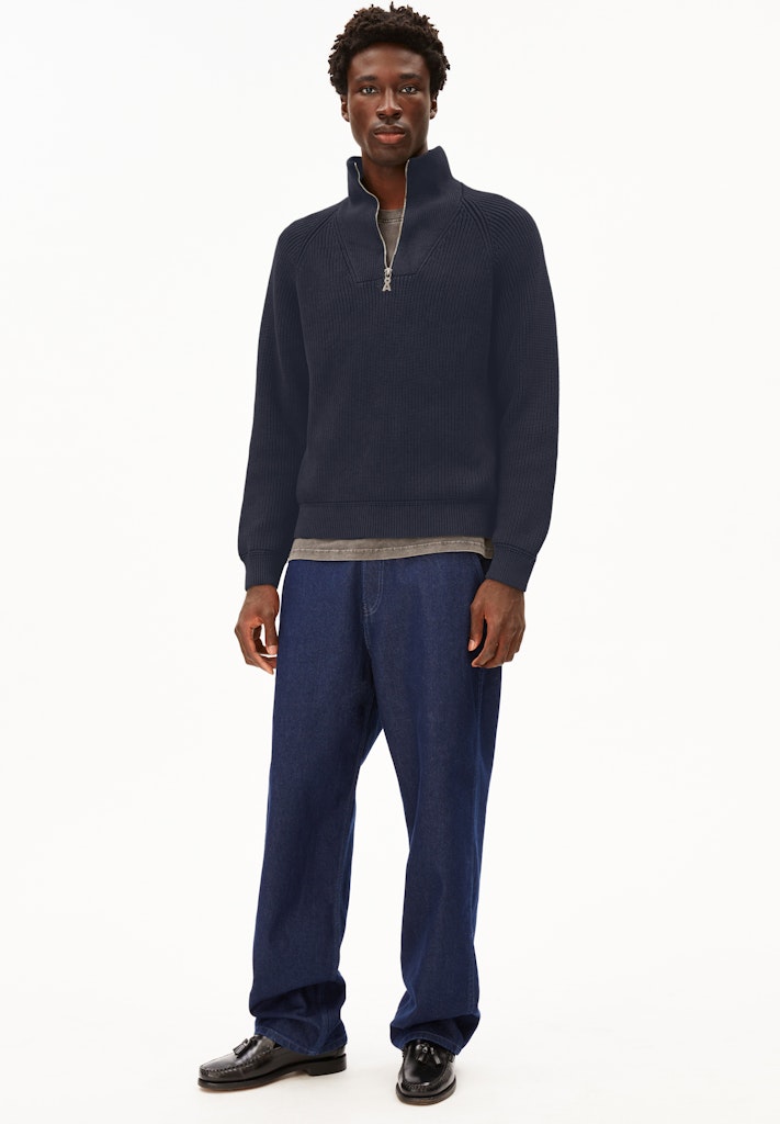 The KAALVES GMT DYE sweater, made from 100% organic cotton, features a straight fit and a high collar with zipper. The troyer-style design makes it a versatile staple and ensures comfortable wear.