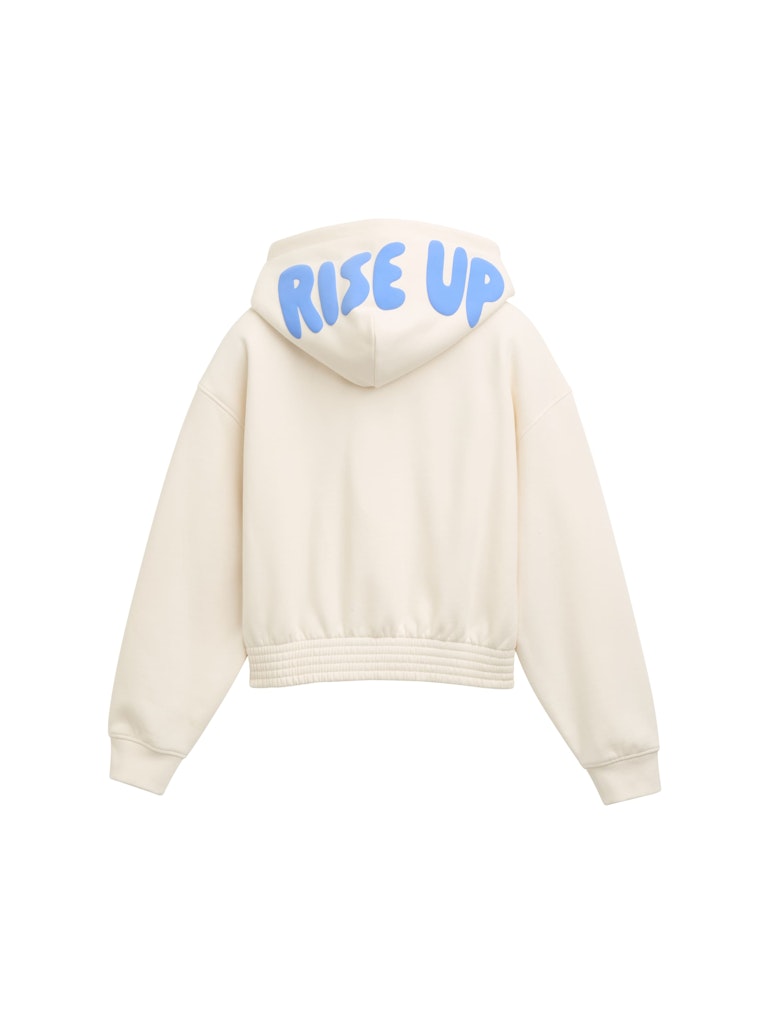 * Cropped Hoodie Sweatshirt mit Textprint auf der Kapuze. Mit überschnittener Schulternaht und elastischem Gummibund am Saum. Leicht aufgerautes Innenfutter sorgt für ein warmes und weiches Tragegefühl.
