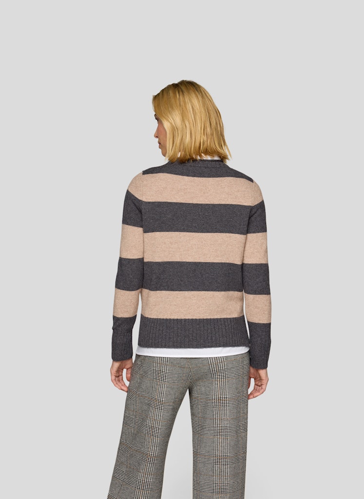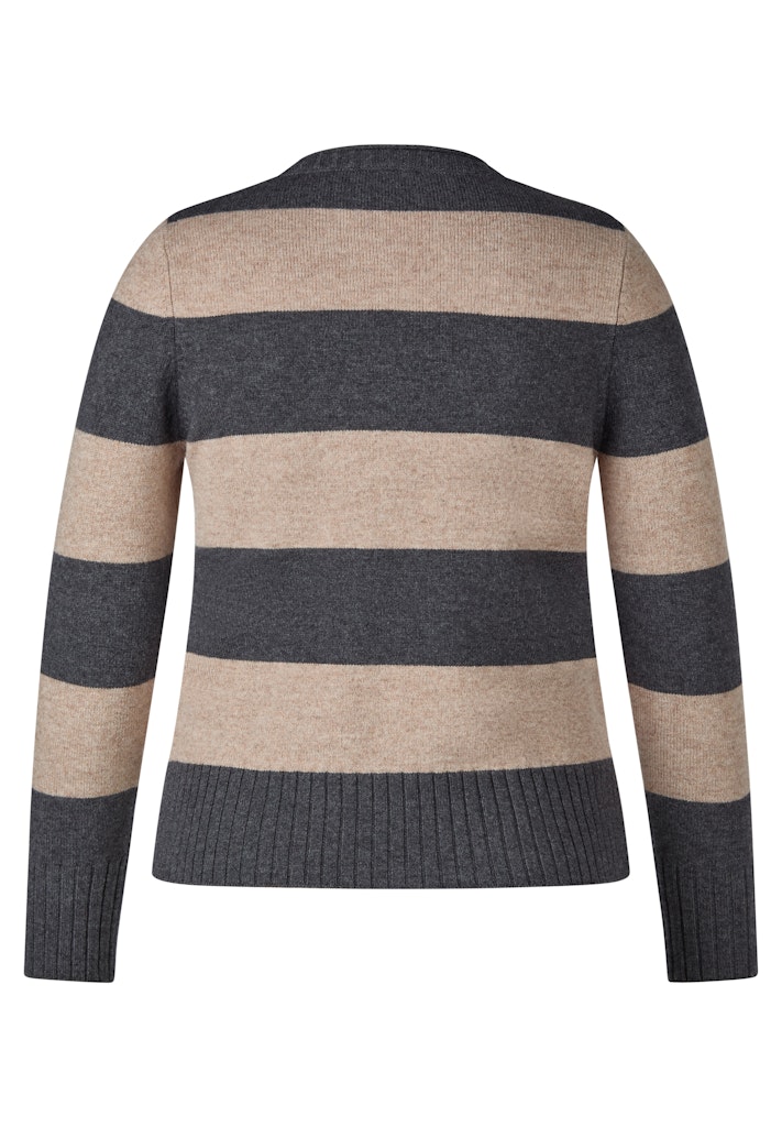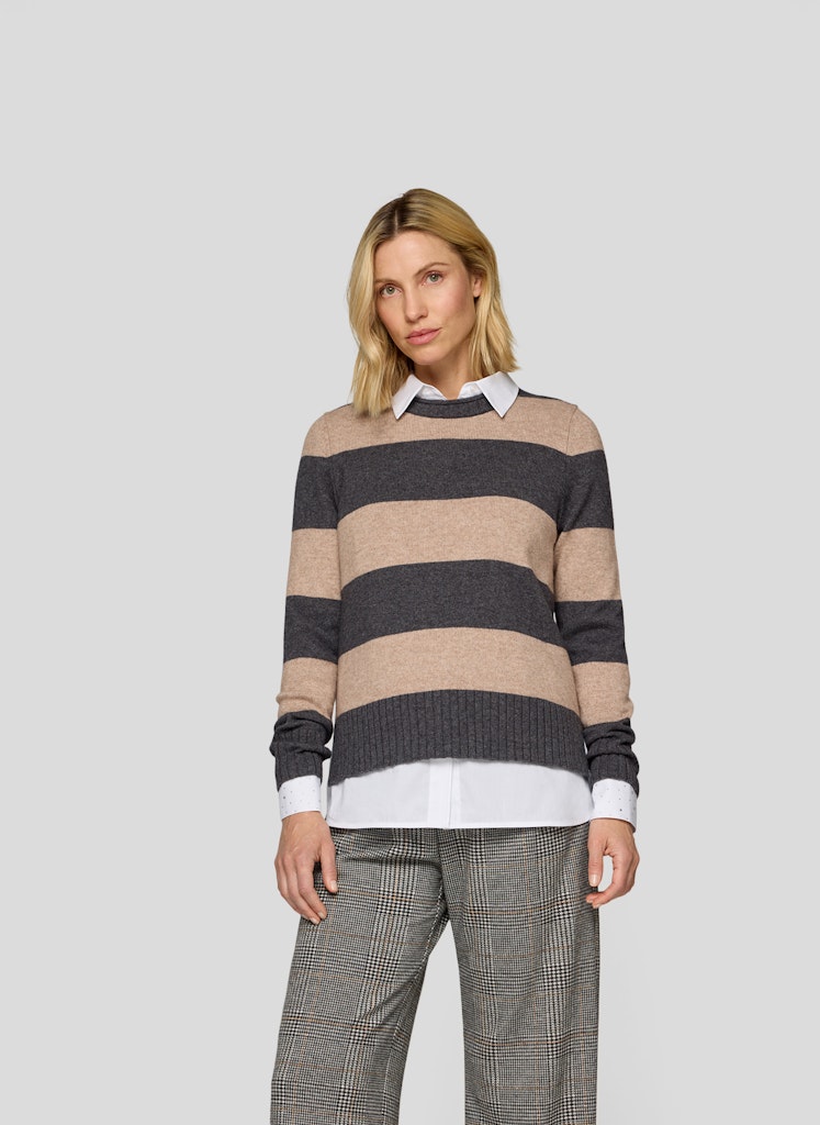 Ein Pullover mit ausdrucksstarkem Ringelmuster und zeitloser Farbgebung. Der Rundhalsausschnitt und die klassische Form machen ihn vielseitig kombinierbar, während der weiche Materialmix mit hohem Wollanteil angenehme Wärme spendet. Ideal für kühlere Tage _ bequem, stilvoll und pflegeleicht. Langlebiger, formstabiler Feinstrick. Hoher Wollanteil für angenehme Wärme. Zeitlose Farbgestaltung im Ringellook. Elastische Bündchen an Saum und Ärmeln. Klassischer Rundhalsausschnitt.