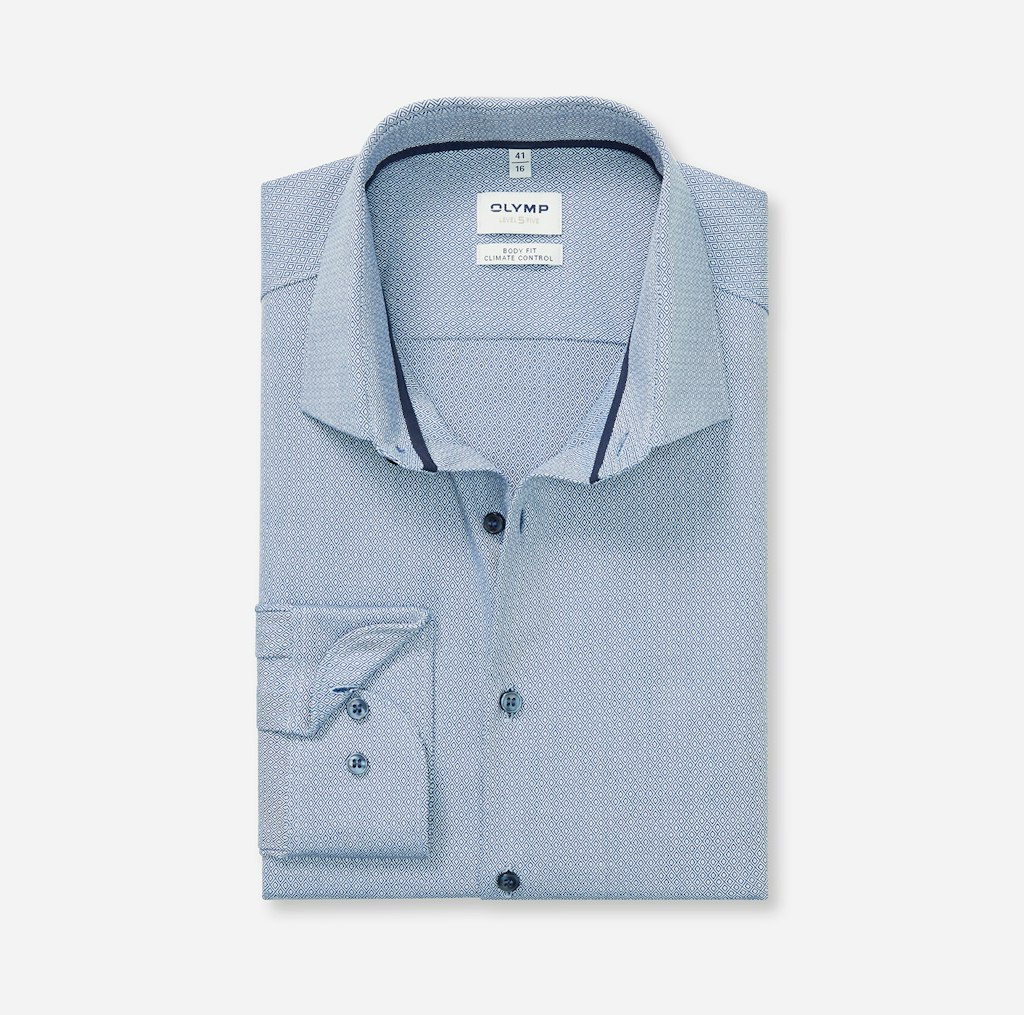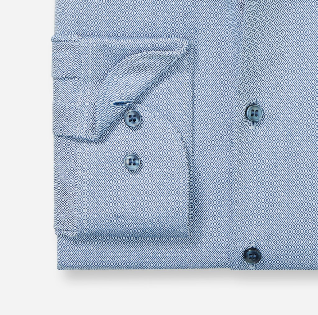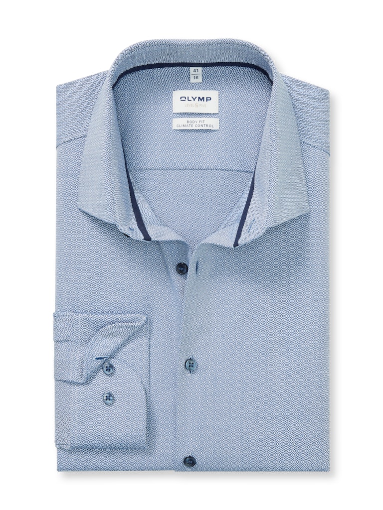Körperbetontes OLYMP Level Five 24/Seven mit Modern Kent, feiner Webstruktur in Marine und funktionaler Performance: Die innovativen Climate-Control-Garne sorgen für hervorragenden Tragekomfort. Sie sind elastisch, feuchtigkeits- und temperaturregulierend, schnelltrocknend und zudem bügelleicht. Kontrast-Tape als modischer Eyecatcher.