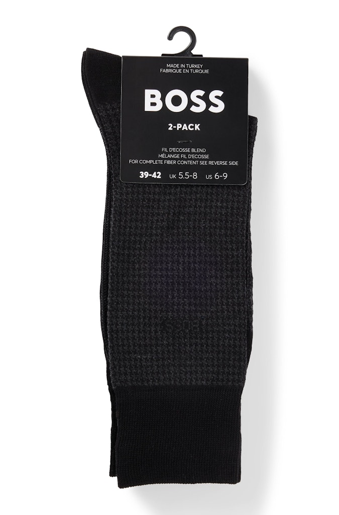 Zwei Paar mittelhohe BOSS Socken aus merzerisierter Baumwolle mit Branding, die sich unifarben und gemustert präsentieren.