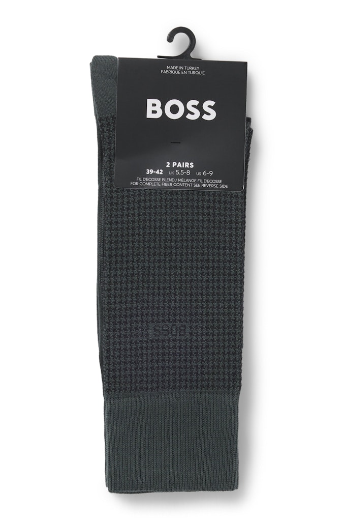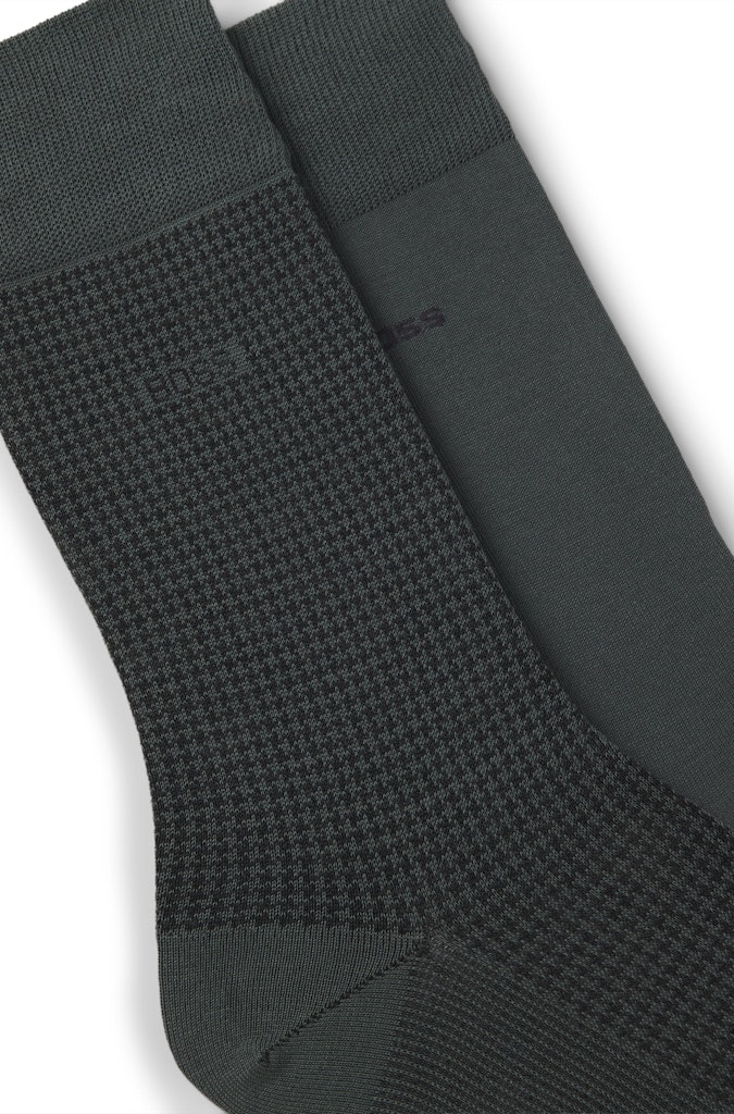 Zwei Paar mittelhohe BOSS Socken aus merzerisierter Baumwolle mit Branding, die sich unifarben und gemustert präsentieren.