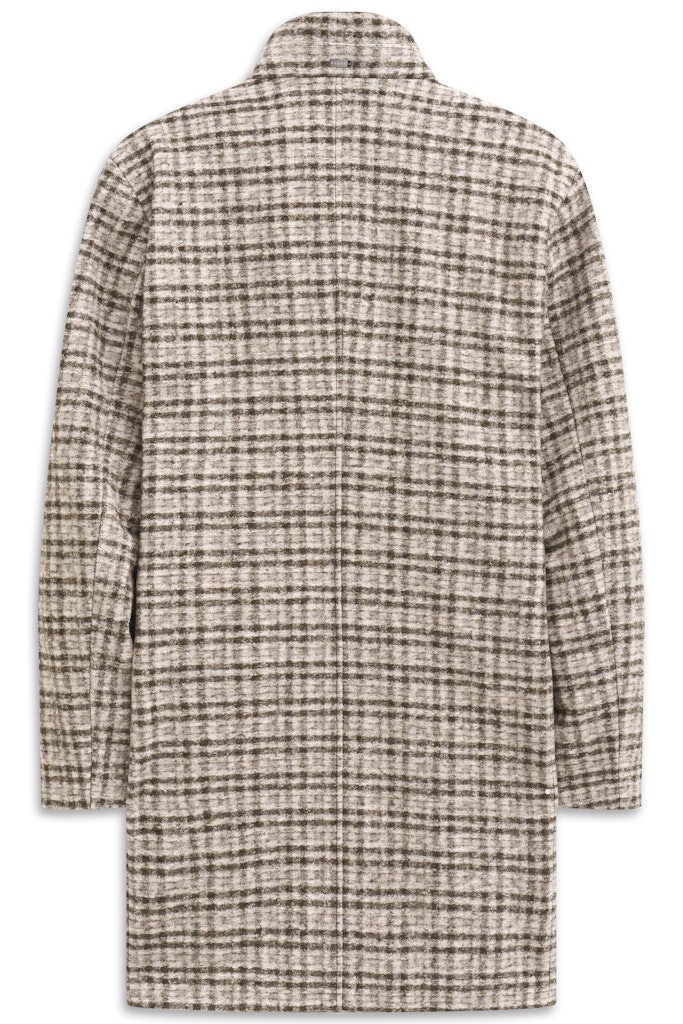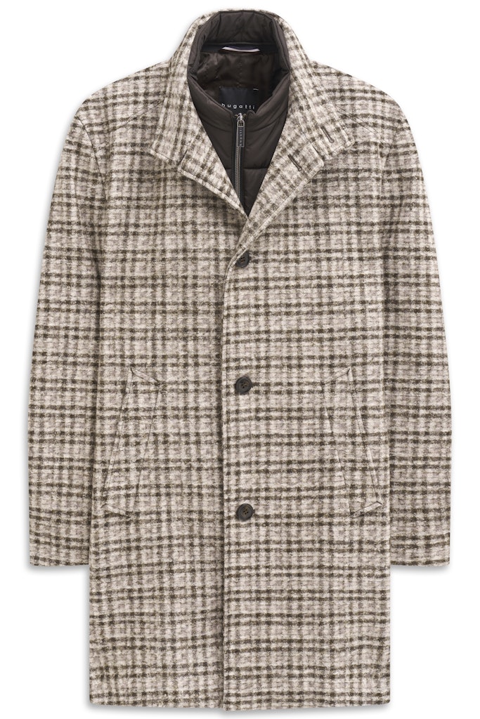 Klassischer Stehkragenmantel mit heraustrennbarem Westenfake und schrägen Leistentaschen. Innen ein ganzes Futter mit Flexcity Einsätzen im Rücken und Innentaschen. Der Artikel mit einer Woll-Baumwollmischung hat eine Dessinierung Karo und einen angenehmen Griff.