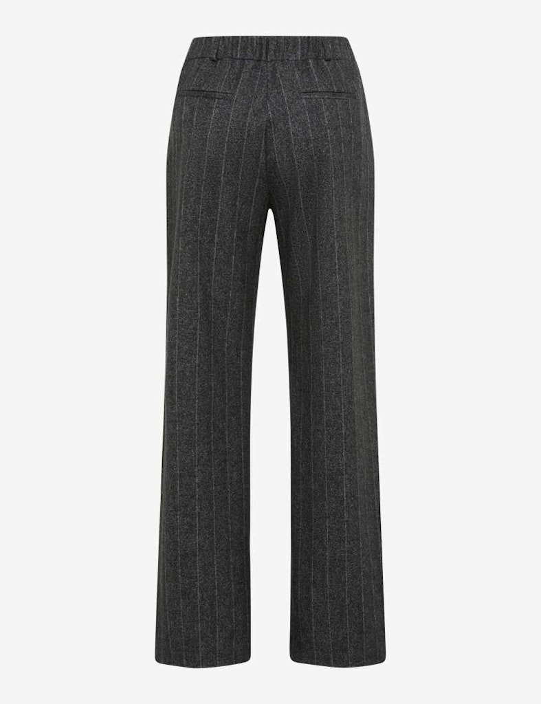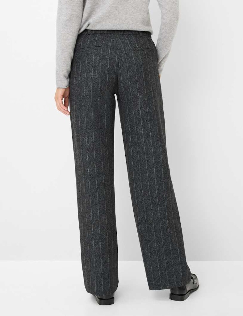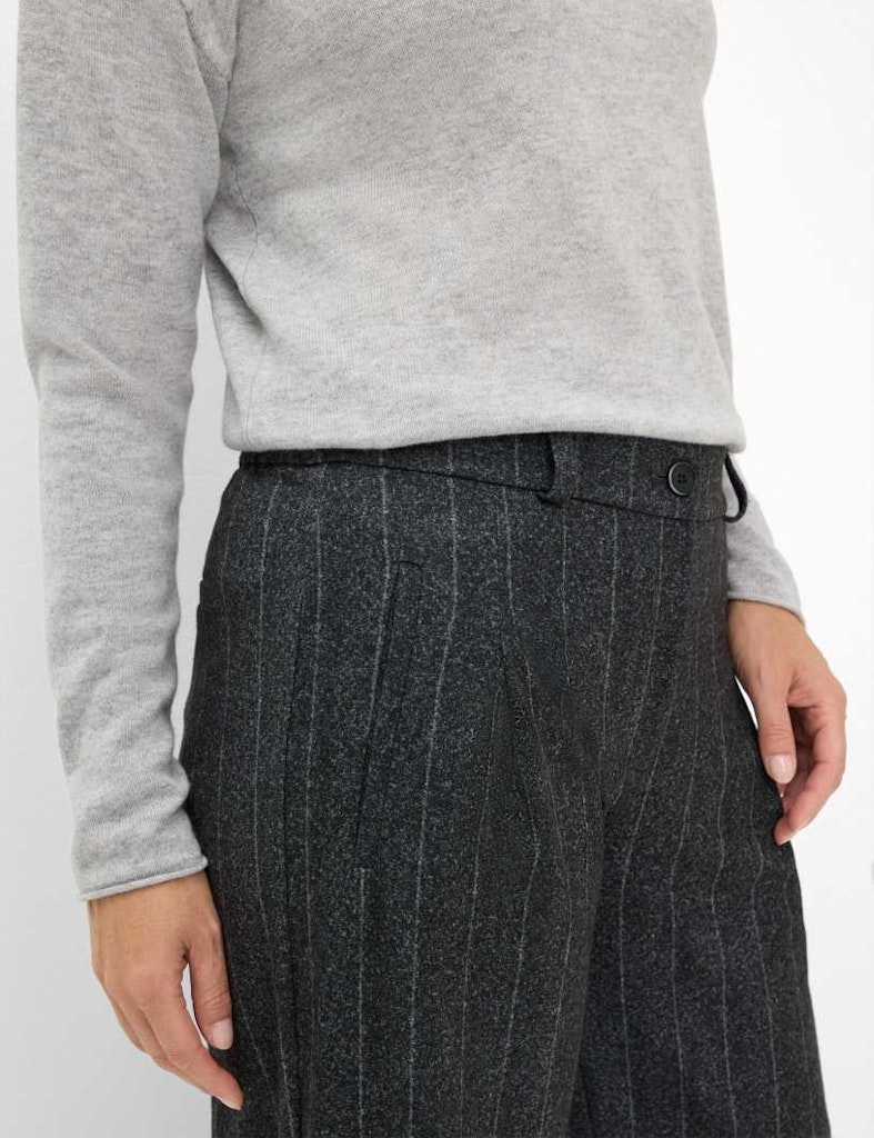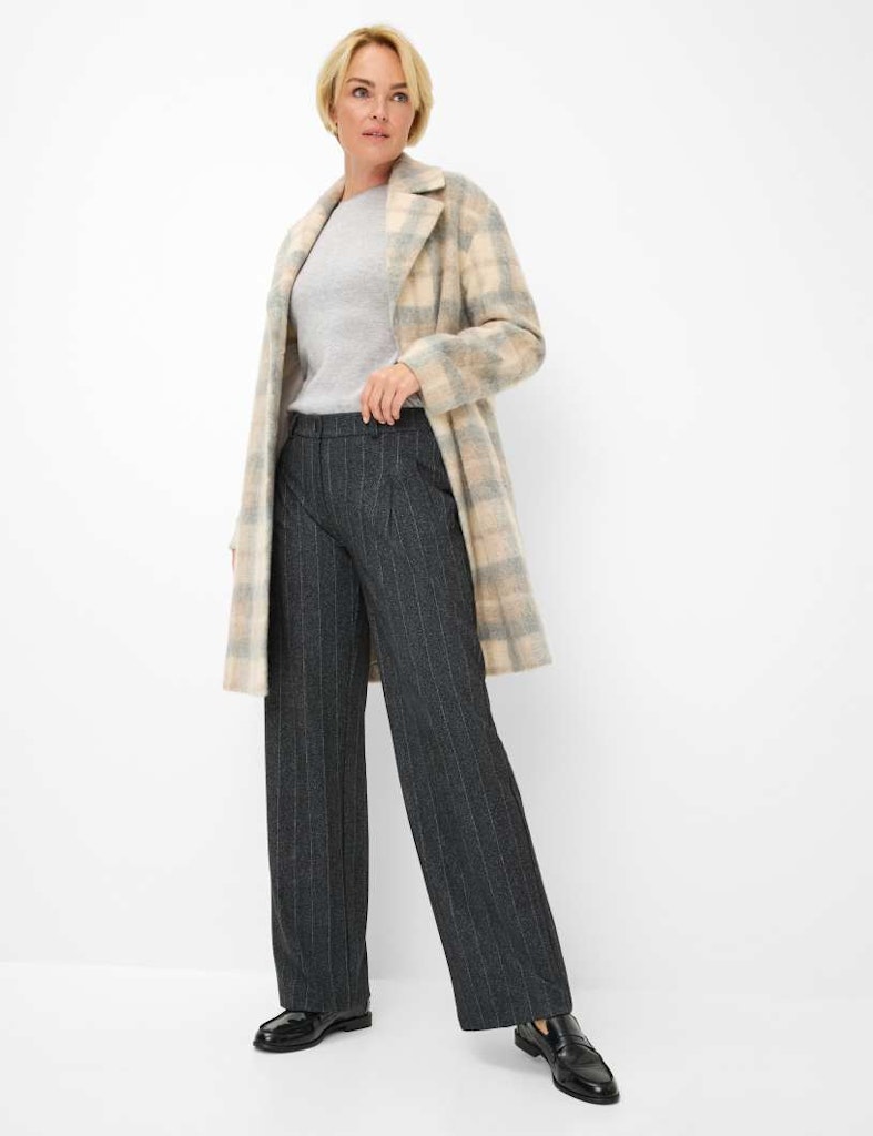 Mit klarer Linie und stilvollem Auftritt: Die Hose im Style PEGGY FLARED ist ein moderner Allrounder für alle, die klassische Eleganz neu denken möchten. Die weite Silhouette in Kombination mit einem Slim Fit sorgt für eine schmeichelhafte Passform und einen fließenden Fall. Dank hoher Leibhöhe und modernen Bundfalten sitzt sie perfekt auf Taille und verlängert optisch das Bein. Der verdeckte Reißverschluss und die präzise platzierten Leistentaschen vorn und hinten unterstreichen den minimalistischen Look mit dezenter Raffinesse. Besonderes Detail: das feine Nadelstreifenmuster. Das Material aus Polyester, Viskose und Elasthan überzeugt durch seine elastische Qualität und den angenehm weichen Griff. Jersey ist bekannt für seine softe, flexible Struktur und trägt sich besonders angenehm. Es passt sich sanft der Figur an, bleibt dabei formstabil und knitterarm . Diese Damenhose verbindet Komfort mit klassischem Stil und ist ein Must-have für Ihre moderne, souveräne Garderobe.